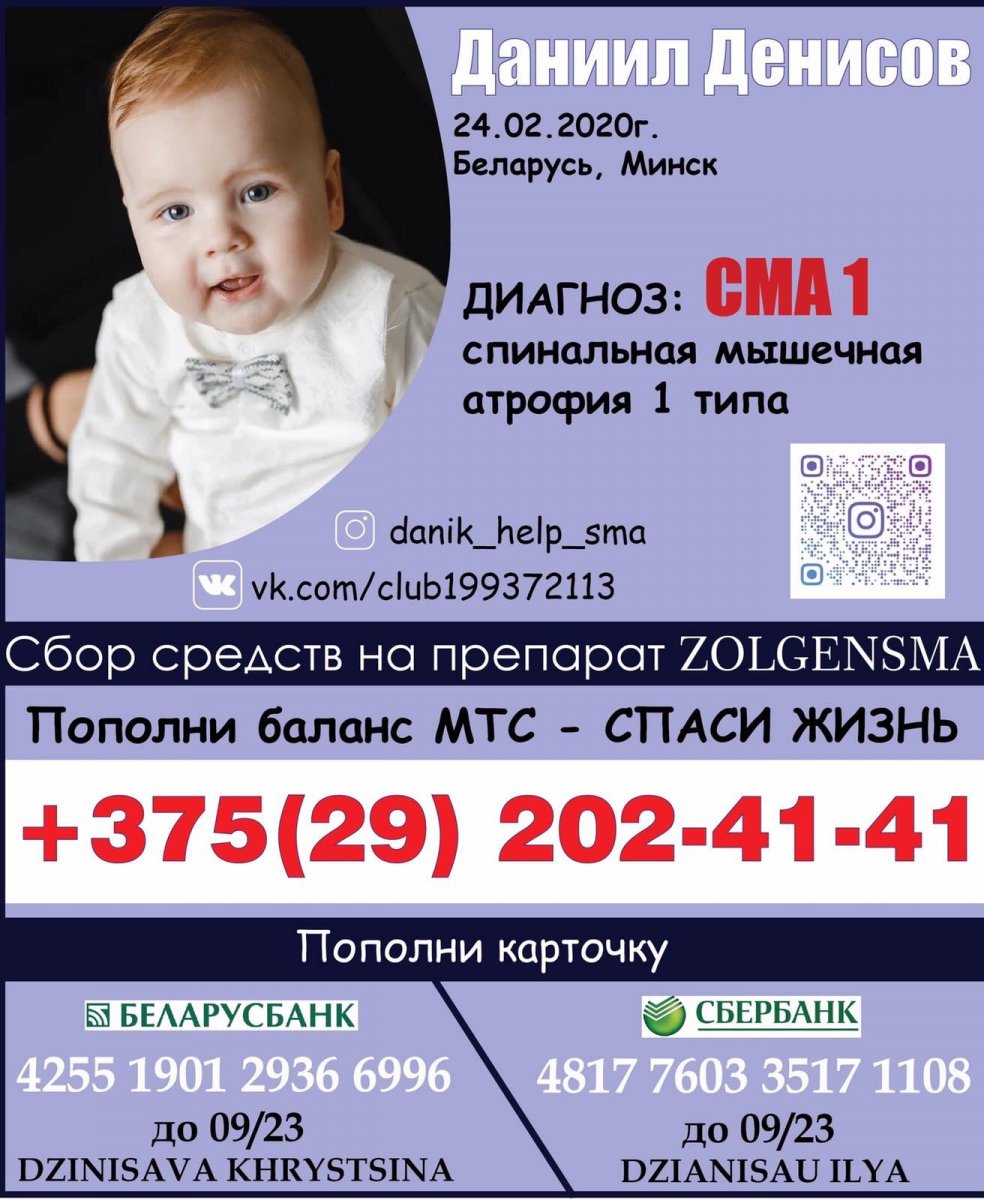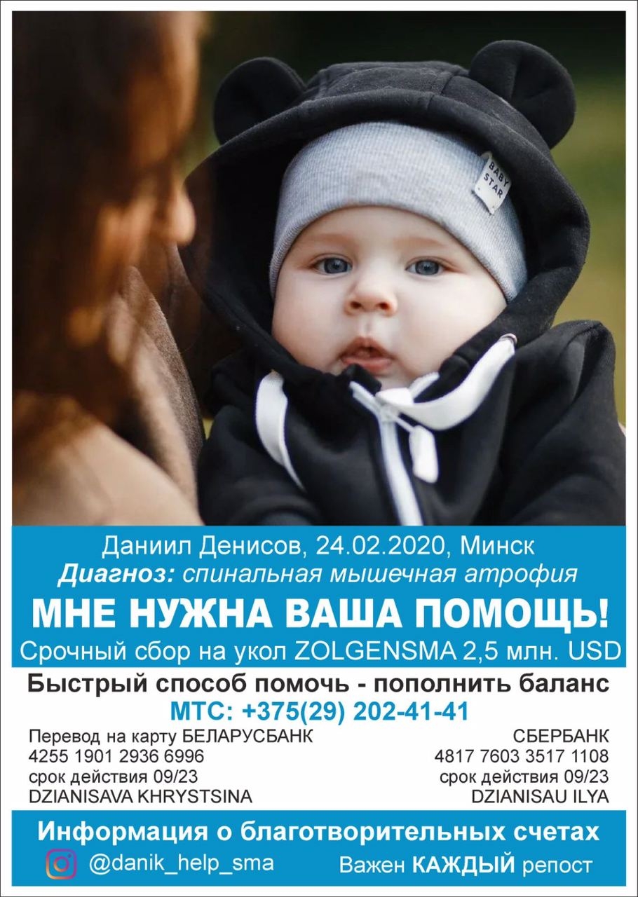 | 26 НОЯБРЯ 2020 (Четверг) 15:12:51 В нашу редакцию пришло письмо от родителей маленького Даниила, которому очень нужна помощь."Обращаемся к вам с просьбой об оказании посильной финансовой и информационной помощи в лечения нашего сына Денисова Даниила Ильича. Денисов Даниил (г Минск) родился 24 февраля 2020 г. В сентябре 2020, в 7 месяцев ему поставили страшный диагноз СПИНАЛЬНАЯ МЫШЕЧНАЯ АТРОФИЯ (SMA) 1-го типа. У нашей семьи нет возможности самостоятельно оплатить лечение, поэтому мы просим о любой помощи у Вас. Благодаря неравнодушным людям и нашими силами, на данный момент уже собрано 50.239 долларов США. Мы умоляем Вас помочь нам в неподъёмном для простой семьи сборе! С благодарностью примем помощь в любом, возможном для Вас виде – как финансовую, так и информационную поддержку на Ваших ресурсах. Очень рассчитываем на Ваше участие в это непростое для нашей семьи время. У Данечки есть страничка в инстаграм danik_help_sma, здесь мы публикуем наши успехи". БЛАГОТВОРИТЕЛЬНЫЕ СЧЕТА открыты на имя Dzianisava Khrystina Банк ЦБУ 500 "АСБ БЕЛАРУСБАНК" УНП 100325912 МФО AKBBBY2X 🇧🇾 BYN (белорусский рубль) BY24 AKBB 3134 0000 0039 8007 0000 🇷🇺 RUB (российский рубль) BY89 AKBB 3134 3000 0018 3007 0000 🇺🇸 USD (доллары США) BY86 AKBB 3134 2000 0020 6007 0000 🇪🇺 EUR (евро) BY23 AKBB 3134 1000 0023 3007 0000 ТРАНЗИТНЫЙ СЧЕТ BY28 AKBB 3819 3821 0001 7000 0000 Контакт для связи, мама Кристина Николаевна, моб. тел.:+375445390779, почта danik.help.sma@yandex.by. / sobor.by/ (Документы)(просмотров 3359) |