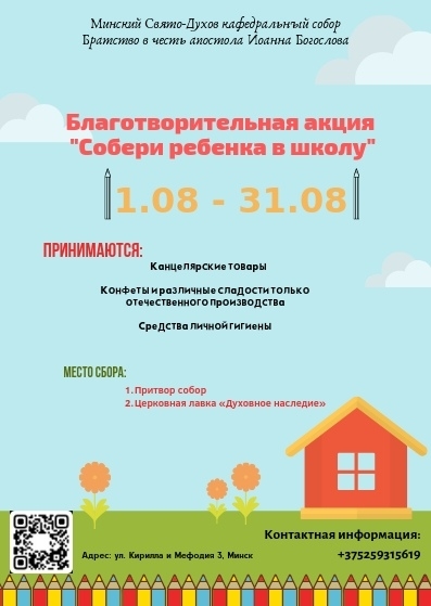 | | 2 АВГУСТА 2019 (Пятница) 15:36:14 1-31 августа минское молодёжное православное братство Иоанна Богослова и Свято-Духов кафедральный собор проводят акцию "Соберём ребёнка в школу".