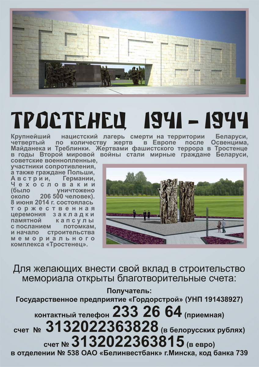 | 13 МАРТА 2015 (Пятница) 15:27:00 В транспорте и общественных местах появилась социальная реклама с просьбой помочь в завершении строительства мемориального комплекса «Тростенец». В 2014-2015 городские власти выделили 82 млрд. бел. руб., параллельно на благотворительные счета от зарубежных спонсоров поступило 100 тыс. евро. От белорусских организаций было перечислено 17 млн. бел. руб. Этих денег, к сожалению, недостаточно для завершения строительства и благоустройства мемориала, поэтому Мингорисполком через социальную рекламу пригласил помочь завершить строительство, как говорится, «всем миром». Открытие комплекса запланировано на 9 мая этого года, к 70-летию Победы над фашистской Германией. Еще совсем недавно на месте, где в годы войны находился лагерь смерти «Тростенец», можно было увидеть пустырь со следами хозяйственной деятельности, там были дачи ветеранов Великой Отечественной войны. И только на месте, где 30 июня 1944 фашисты сожгли 6500 человек, был установлен памятник. Затем со стороны трассы Минск-Могилев был сооружен обелиск. В 1994 году Постановлением Президиума Верховного Совета и Правительства было принято решение «О создании мемориального комплекса «Тростенец», но, к сожалению, идея так и осталась на бумаге. Эта земля, пропитанная кровью, долгие годы не была должным образом ни исследована, ни увековечена мемориалом как память жертвам фашизма. В «Тростенце» неоднократно велись земляные работы, прокладывались трубопроводы, была уничтожена часть «аллеи смерти», была построена АТС. Возле Благовщины находилась свалка минского мусора. Такая ситуация огорчала не только историков и общественных деятелей, но и простых людей, которые помнили из рассказов своих родителей и дедов, какая трагедия происходила на этой многострадальной земле, в прямом смысле пропитанной человеческой кровью. Очевидцы вспоминали, что вода в речке Тростянке была бурой от крови. В этом месте было уничтожено 206 500 человек. Сегодня ситуация изменилась. Летом 2014 года состоялась торжественная закладка памятной капсулы, и началось строительство мемориального комплекса. Над концепцией мемориала и архитектурным проектом работали архитекторы Анна Аксенова, Виктор Почечуев, Елена Постникова, скульптор Константин Костюченко. Руководитель второго авторского коллектива – архитектор Леонид Левин, вместе с ним работали скульпторы Максим Петруль, Александр Шаппо, Константин Селиханов, архитекторы Галина Левина, Александр Копылов. Белорусским скульптором Константином Костюченко создана бронзовая скульптура, которая должна будет находиться в центре мемориального комплекса. Посетители комплекса будут входить через «Врата памяти», на которых скульптор изобразил людей, которым предстояло пройти путь нечеловеческих мук в один конец. Территория «Тростенца» делится на 4 отдельных зоны: места, где принимали узников; « дороги смерти», по которой людей вели в лагерь или к месту казни; самого лагеря «Тростенец» и урочища Благовщина, где расстреляли более 150 тыс. человек. Три первых расположены по правую сторону Могилевского шоссе при выезде из города, последний – по другую сторону трассы. Желающие оказать финансовую помощь в завершении строительства мемориального комплекса «Тростенец» могут перечислить деньги на следующие счета: Получатель – Государственное предприя