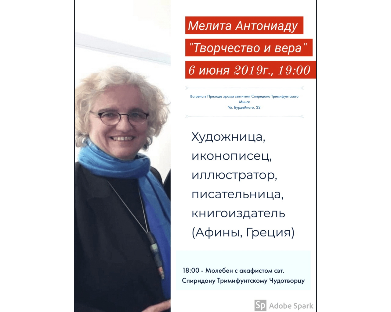 | | 3 ИЮНЯ 2019 (Понедельник) 13:15:37 6 июня в 19:00 в приходе святителя Спиридона Тримифунтского города Минска состоится встреча с греческой художницей, писательницей и иллюстратором Мелитой Антониаду (Афины, Греция). Тема - "О вере и творчестве".