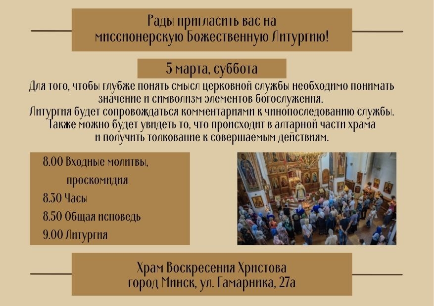 Храм Воскресения Христова, город Минск, улица Гамарника, 27а, приглашает на миссионерскую Литургию 5 марта, в субботу в 8:50. Как считают в приходе, миссионерское богослужение необходимо для того, чтобы глубже понять смысл церковной службы необходимо понимать значение и символизм элементов богослужения.