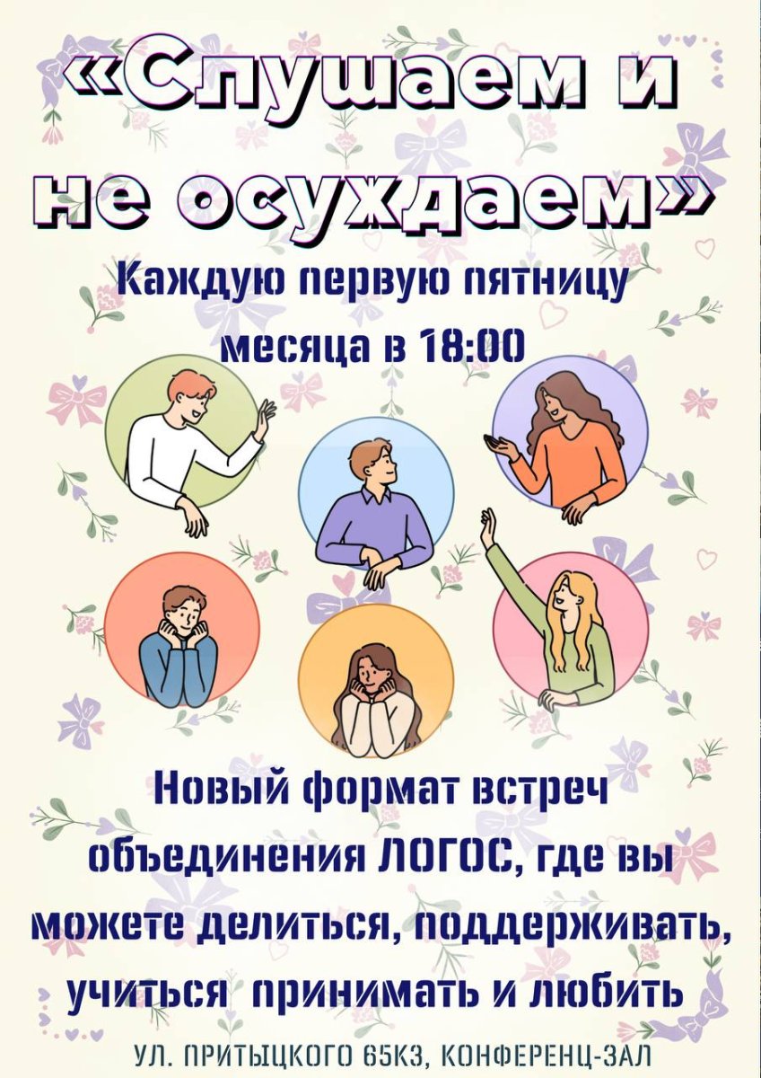 Каждую первую пятницу месяца в 18.00 участники "Логос" будут общаться в новом формате "Слушаем и не осуждаем", где можно делиться, поддерживать, учиться слушать и любить.
