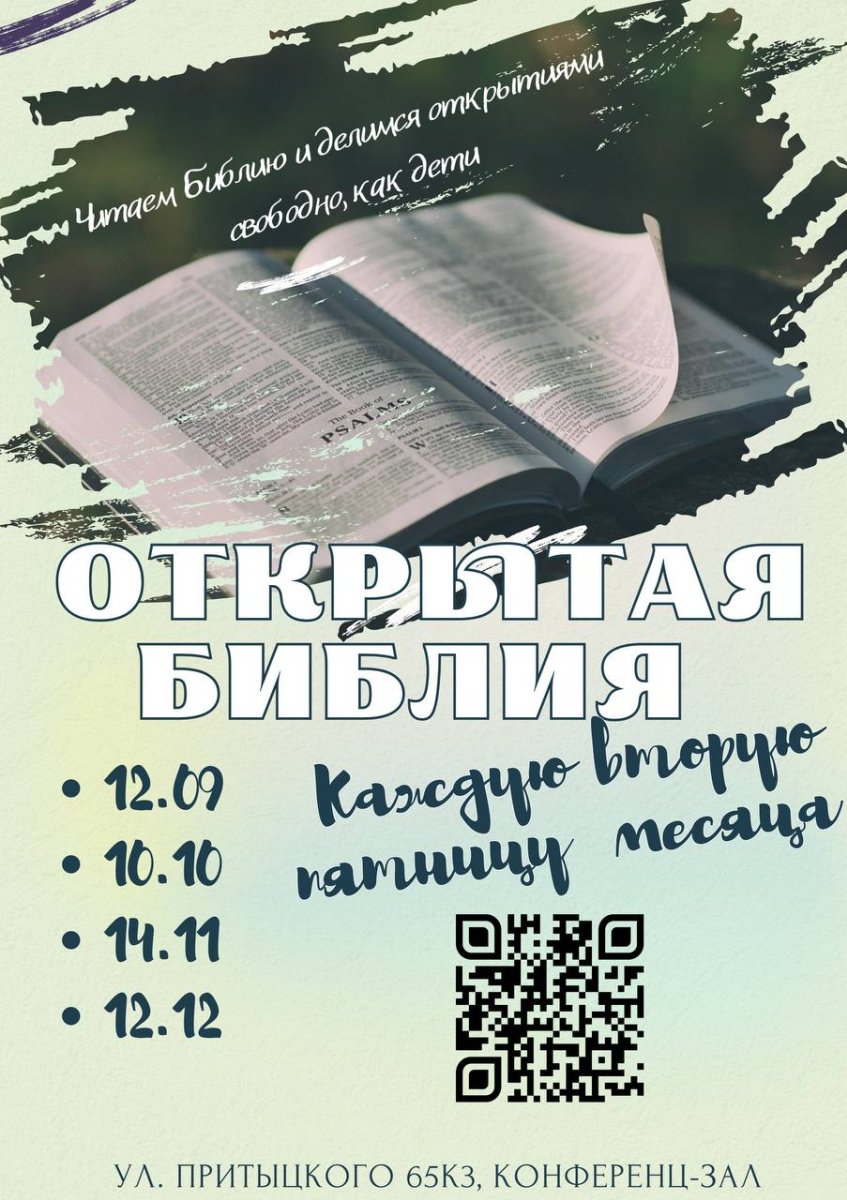 Каждую вторую пятницу месяца в 18.00 - общение в формате "Открытая Библия". "Будет читать Библию вместе и делиться открытиями свободно, как дети", - рассказали участники "Логос".