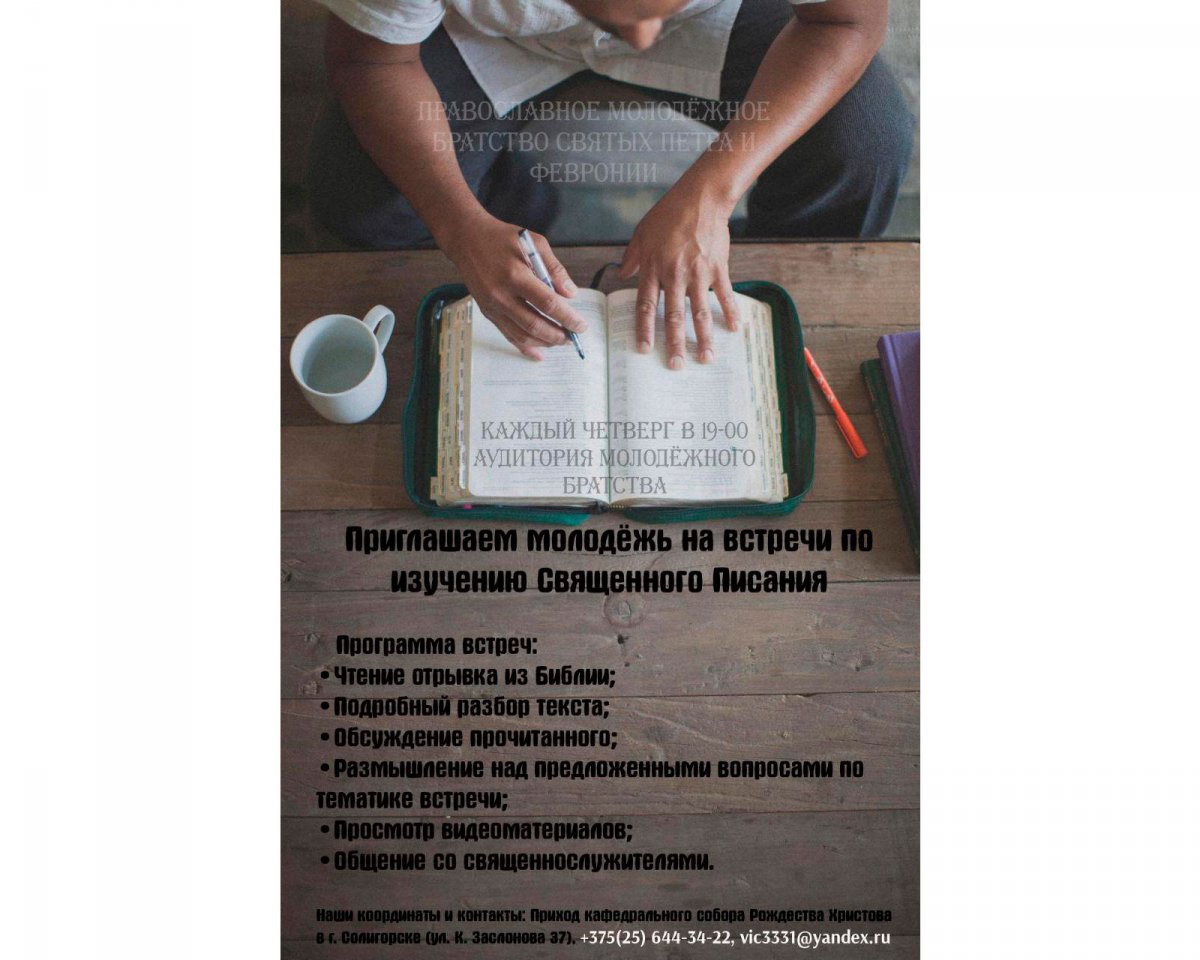 | | 13 НОЯБРЯ 2019 (Среда) 11:25:05 Еженедельно, по четвергам, в Библейском кабинете Миссионерского Центра кафедрального собора Рождества Христова в Солигорске проводятся молодёжные встречи по изучению Священного Писания.