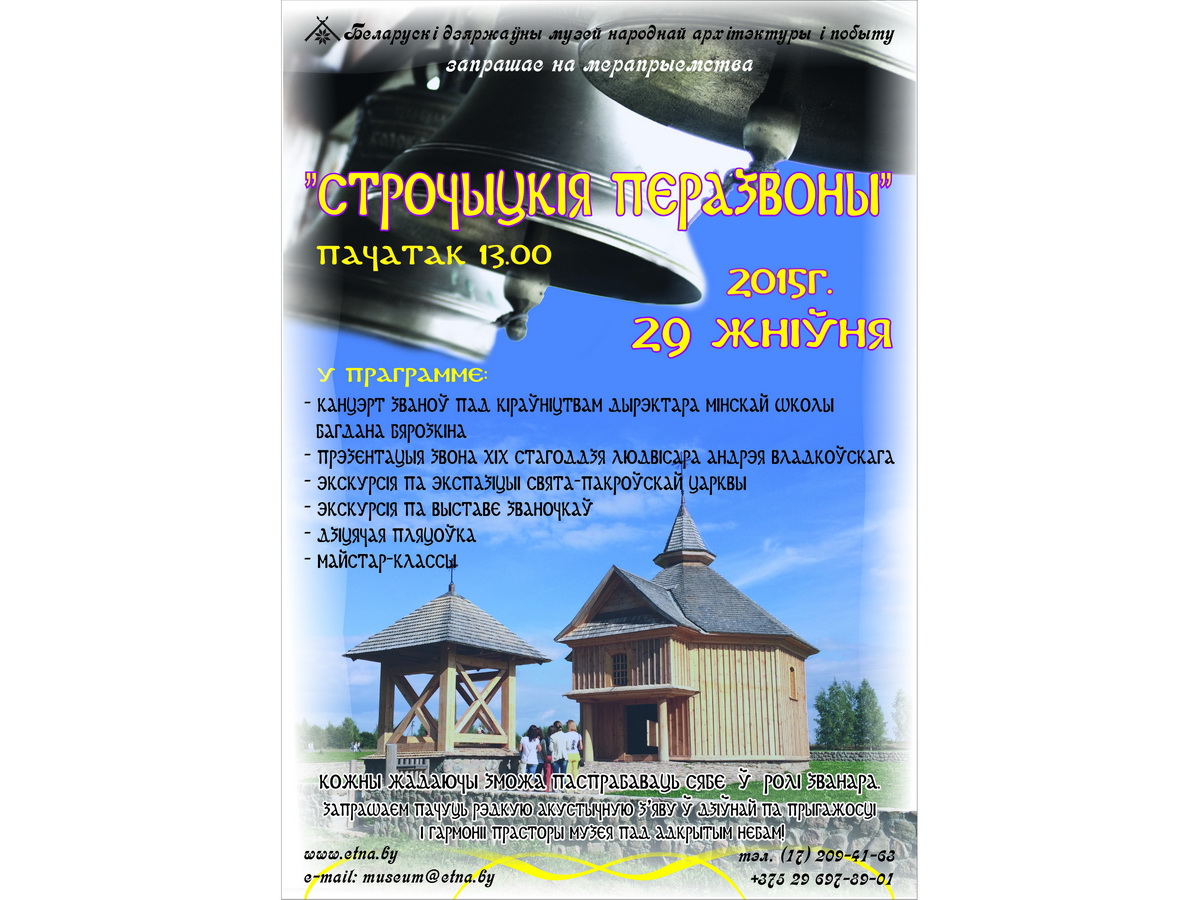 | | 27 АВГУСТА 2015 (Четверг) 14:21:43 29 жніўня ў 13.00 Беларускі дзяржаўны музей народнай архітэктуры і побыту запрашае на мерапрыемства "Строчыцкія перазвоны".
