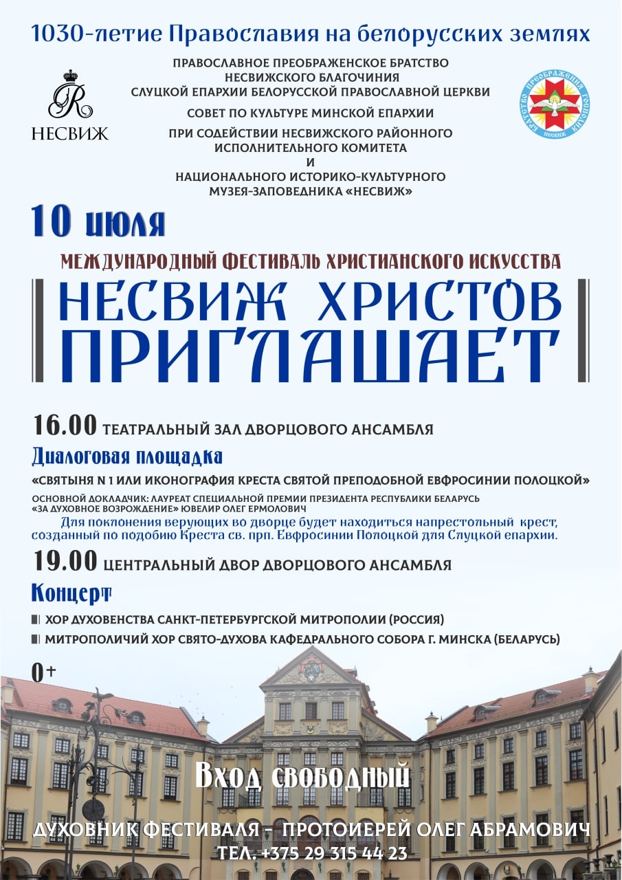 | 1 ИЮЛЯ 2022 (Пятница) 21:43:34 По благословению митрополита Минского и Заславского Вениамина, Патриаршего Экзарха всея Беларуси, православное Преображенское братство Несвижского благочиния Слуцкой епархии, Совет по культуре Минской епархии, при содействии Несвижского районного исполнительного комитета и национального историко-культурного музея-заповедника "Несвиж" сообщает, что 10 июля 2022 года состоится Международный фестиваль христианского искусства "НЕСВИЖ ХРИСТОВ ПРИГЛАШАЕТ", приуроченный 1030-летию Православия на белорусских землях.16:00- ТЕАТРАЛЬНЫЙ ЗАЛ ДВОРЦОВОГО АНСАМБЛЯ. Диалоговая площадка "Святыня №1 или иконография креста святой преподобной Евфросинии Полоцкой". Основной докладчик: лауреат специальной премии президента Республики Беларусь "За духовное возрождение" Ювелир Олег Ермолович. Для поклонения верующих во дворце будет находиться напрестольный крест, созданный по подобию Креста святой преподобной Евфросинии Полоцкой для Слуцкой епархии. 19:00- ЦЕНТРАЛЬНЫЙ ДВОР ДВОРЦОВОГО АНСАМБЛЯ. Концерт: Хор духовенства Санкт-Петербургской митрополии (Россия); Митрополичий хор Свято-Духова кафедрального собора г. Минска (Беларусь). ВХОД СВОБОДНЫЙ! Духовник фестиваля-протоиерей Олег Абрамович. / sobor.by/ (просмотров 1491) |