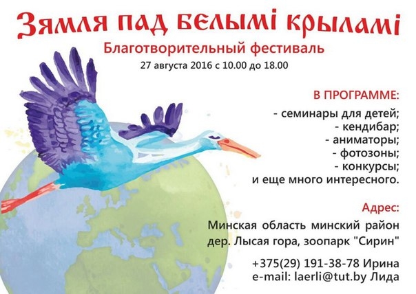 | | 3 АВГУСТА 2016 (Среда) 12:10:09 27 августа в контактном зоопарке "Сирин" пройдет благотворительный фестиваль "Зямля пад белымi крыламi" — эколого-просветительский форум, посвященный птицам.