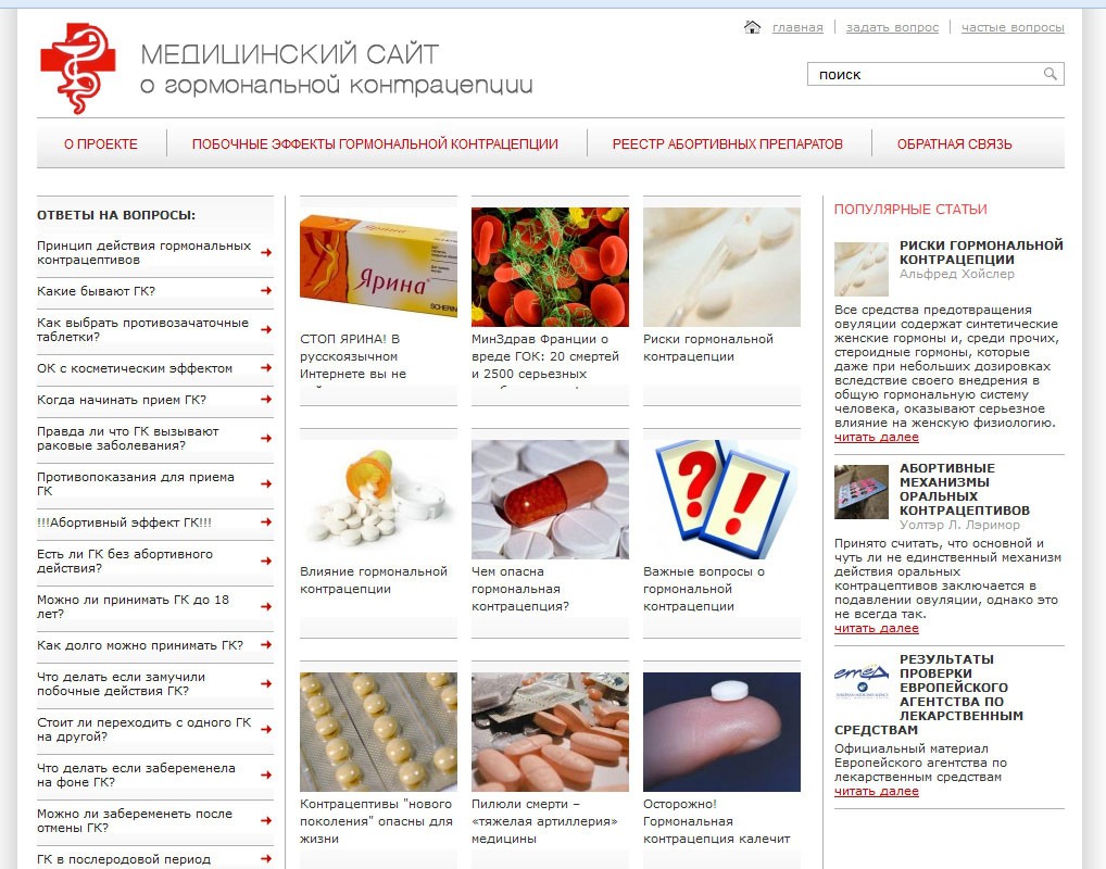 Начал работу медицинский сайт о гормональной контрацепции contracepcia.com/, созданный с целью информирования женщин и девушек о средствах контрацепции.Ресурс призван дать правдивую информацию о реальных рисках осложнений, вызываемых приемом ГК.