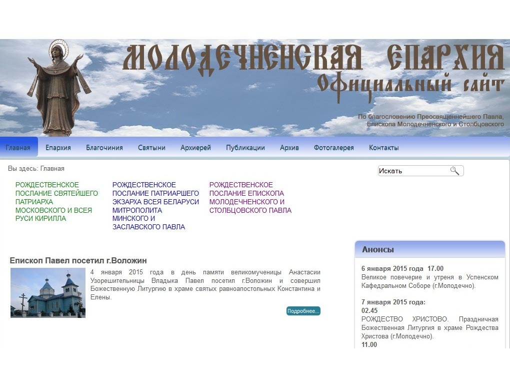 | | 5 ЯНВАРЯ 2015 (Понедельник) 14:50:09 По благословению епископа Молодечненского и Столбцовского Павла, открылся официальный сайт Молодечненской епархии Минской митрополии Белорусской Православной Церкви.