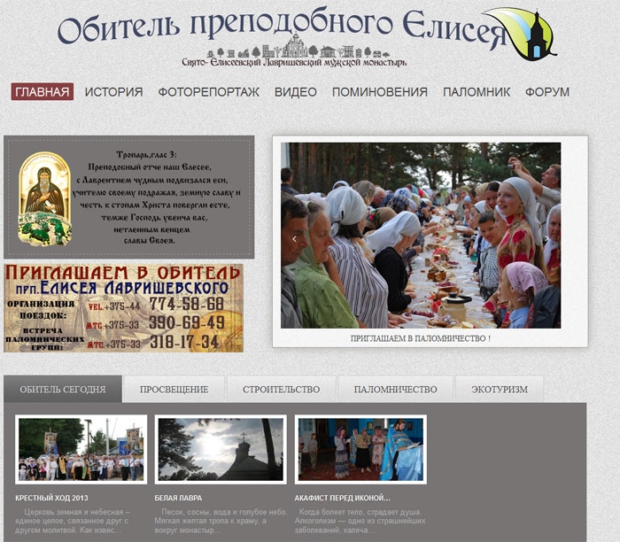 | | 2 СЕНТЯБРЯ 2013 (Понедельник) 15:03:30 Начал работу сайт монастыря Святого преподобного Елисея Лавришевского lavra.by. На новом православном ресурсе можно почерпнуть сведения об истории обители и узнать, как живёт монастырь сегодня.