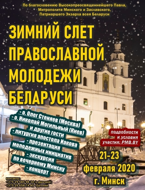 | | 12 ФЕВРАЛЯ 2020 (Среда) 13:25:41 С 21 по 23 февраля, по благословению митрополита Минского и Заславского Павла, Патриаршего Экзарха всея Беларуси, в Минске состоится зимний слёт православной молодёжи Беларуси. Организатором форума выступает Синодальный отдел по делам молодёжи Белорусской Православной Церкви при поддержке молодёжных братств и коллективов столицы.