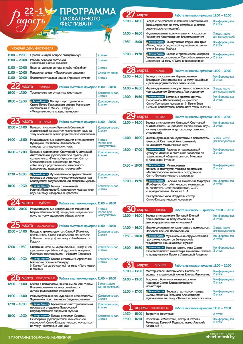 | 21 МАРТА 2018 (Среда) 13:44:53 Международный пасхальный фестиваль "Радость" пройдёт с 22 марта по 1 апреля в минском Дворце искусств (ул.Козлова, 3) по благословению митрополита Минского и Заславского Павла, Патриаршего Экзарха всея Беларуси. Фестиваль будет проходить в будние дни с 11:00 до 20:00, в выходные — с 10:00 до 20:00. Вход свободный.Открытие фестиваля "Радость" состоится 22 марта в 16:00. В торжественной церемонии примут участие митрополит Минский и Заславский Павел, представители государственной власти. Участники В этом году фестиваль принимает более 70 участников из 9 государств. О некоторых из них мы расскажем подробнее. Беларусь: Свято-Елисеевский Лавришевский мужской монастырь По преданию, обитель была основана сыном Литовского князя Тройната, преподобным Елисеем Лавришевским, около 1225 года на левом берегу Немана. Чистый воздух, благоухание трав, ощущение душевного спокойствия — вот что останется в памяти каждого, кто побывает там. Россия: Аланский Успенский мужской монастырь Этот монастырь ещё совсем молодой — он был построен в горах Северной Осетии в 2000 году. В первый год существования в нём было всего два монаха! А сегодня насельников уже более двадцати, обитель растёт и удивляет паломников своей внешней и внутренней духовной красотой. Украина: Свято-Троицкий Дерманский женский монастырь Монастырь был создан в конце XV столетия магнатом и князем Константином Острожским. При советской власти обитель постигла та же участь, что и многие другие, — она была закрыта, а имущество —разграблено... В 90-х годах XX века обитель начала возрождаться и постепенно, благодаря упорным трудам, восстановила прежний облик. Молдова: храм святителя Спиридона Тримифунтского В 1802 году в селе Миклешты, что в восточной части Молдовы, на средства помещика Манолакия Донича была возведена небольшая каменная церковь. Храм был освящён во имя святого Спиридона Тримифунтского. Здание относится к довольно редкому типу церковных построек, которые отличаются архаичностью облика. Греция: Святая Гора Афон, скит Пророка Илии Он основан в 1757 году выдающимся славянским просветителем Паисием Величковским. Когда возле него собралось целое братство, он испросил в греческом монастыре Пантократора старую необитаемую келлию. Вскоре на её месте "вырос" скит. В 1881 году завершилось строительство соборного храма, посвящённого Илие Пророку. Этот храм считается одним из самых красивых на Святой Горе. Сербия: монастырь Святой Троицы Монастырь в старейшем сербском поселении Беле Воде известен далеко за пределами страны благодаря своей музыкальности. В 2013 году под руководством настоятеля монастыря отца Серафима был создан ансамбль "Србче". Духовные песнопения в исполнении этой группы волнуют сердца и души слушателей из разных стран. Сербский коллектив принимал участие и в минском фестивале православных песнопений "Державный глас". Черногория: монастырь преподобного Сергия Радонежского В ущелье между Адриатическим морем и Скадарским озером возвышается гора, которая носит необычное имя — Румия (в переводе с арабского — "христианка"). У её подножия расположен монастырь преподобного Сергия Радонежского. Обитель основана в 2009 году. Монастырь населяют русские монахини. В обители прп. Сергия Радонежского хранятся частицы мощей преподобного Димитрия Ростовского, святого Гурия