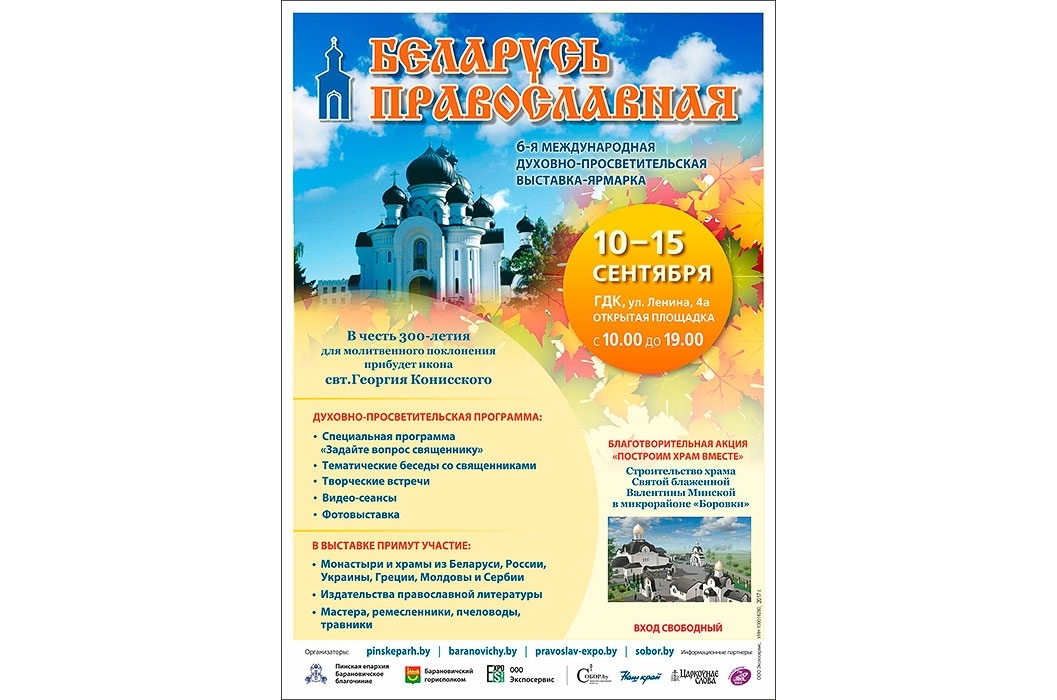 С 10 по 15 сентября в Барановичах пройдёт 6-я духовно-просветительская выставка-ярмарка "Беларусь православная". Экспозиция разместится на открытой площадке у городского Дома культуры (ул. Ленина, 4а). Время работы - с 10.00 до 19.00, в последний день до 16.00.