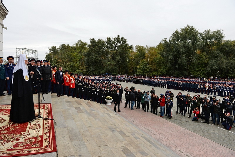 | 19 ОКТЯБРЯ 2015 (Понедельник) 12:37:51 14 октября, по окончании Литургии в Вознесенском войсковом всеказачьем соборе в Новочеркасске, Святейший Патриарх Московский и всея Руси Кирилл присутствовал на смотре парадных расчётов казачьих округов и кадетских корпусов Всевеликого войска Донского на соборной площади. Предстоятель Русской Церкви обратился к собравшимся со словом.Братья-казаки! Хотел бы всех вас сердечно поздравить с праздником Покрова Пресвятой Богородицы. Наверное, неслучайно этот праздник, связанный с особыми событиями в истории Византии, стал казачьим. Когда враг подошёл к стенам Константинополя, жители поняли, что невозможно военной силой защитить город и избавиться от страшного нашествия. Тогда они обратили свой взор к Богу и у Него стали просить помощи, и во время богослужения во Влахернском храме благочестивому человеку по имени Андрей явилась Пресвятая Богородица с омофором в руках. Андрей рассказал об этом видении всем жителям Константинополя, и они поверили, что Божия Матерь с ними и враг не покорит столицы. Казачьи войска, вообще казаки как класс, жили между жизнью и смертью на протяжении всей своей истории. Они обороняли наши границы, и всегда, когда было трудно, царь и государство призывали казаков на помощь. Даже в самое мирное время, когда в столицах и не думали, что на окраинах идут военные действия, находились внешние силы, заинтересованные в том, чтобы войти на нашу землю, на Русь Святую, захватить эту землю, и первыми, кто встречал нашествия иноплеменников, были наши мужественные казаки. Они жили в местах несения службы вместе с семьями, с детьми, и каждый из них понимал, что в любой момент может оборваться его жизнь и его дети могут стать сиротами. И потому избрали казаки своим особым праздником день Покрова Пресвятой Богородицы, вспоминая о великом спасении, которое принесла Божия Матерь граду Константинополю. Сегодня, в день Покрова Пресвятой Богородицы, состоялось особое замечательное событие — освящение Патриаршего Вознесенского войскового всеказачьего собора. Матвей Иванович Платов, закладывая этот собор и закладывая город Новочеркасск как столицу казаков, знал, что делал. Он знал, что в этом месте должен быть построен храм, величием своим соответствующий величию подвига русских казаков. Закладка собора произошла ровно 210 лет назад, 110 лет назад его освятили. А сегодня мы совершили великое освящение собора после его восстановления. Как во времена, связанные с былинным героизмом казаков, их задачей была защита веры и Отечества, так и сегодня перед казаками должна стоять та же задача. В старину она решалась, в первую очередь, силой оружия. И сегодня могут быть обстоятельства, когда Родину надо защищать силой оружия, но чаще всего опасность приходит вне всяких военных действий. Мы знаем, как изнутри подрываются основы веры и Отечества. И где же здесь, в этой невидимой брани, русское казачество? Говоря "русское", я имею в виду не только Российскую Федерацию, но и весь великий Русский мир. Где это казачество? Оно должно быть на страже и должно быть готово защитить и веру, и Отечество — в первую очередь, своим образом жизни, своей верой, воспитанием своих детей, способностью отражать всякие искушения, несущие опасность и для веры, и для Отечества. Но для того чтобы защищать, нужно знать. Нужно быть верующи