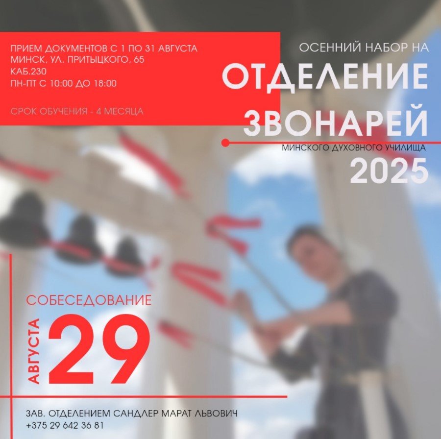 | | 12 АВГУСТА 2025 (Вторник) 12:05:38 Отделение звонарей Минского духовного училища объявляет набор учащихся.