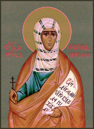 | 2 АПРЕЛЯ 2019 (Вторник) 14:26:15 Святая мученица Фотина была той самой самарянкой, с которой беседовал Спаситель у колодца Иаковлева (Ин. 4, 5 - 42). Во времена императора Нерона (54 - 68), проявившего чрезвычайную жестокость в борьбе с христианством, святая Фотина жила в Карфагене со своим младшим сыном Иосией и там безбоязненно проповедовала Евангелие. Её старший сын Виктор храбро сражался в римских войсках против варваров и за свои заслуги был назначен военачальником в город Атталию (Малая Азия).Градоначальник Атталии Севастиан при встрече со святым Виктором сказал ему: "Я знаю достоверно, что ты, твоя мать и твой брат - последователи учения Христа. Но я по-дружески советую тебе - подчинись воле императора, за это будешь получать имущество христиан, которых ты доставишь нам. Твоим же матери и брату я напишу, чтобы они не проповедовали Христа открыто. Пусть тайно исповедуют свою веру". Святой Виктор ответил: "Я сам хочу быть проповедником христианства, как мои мать и брат". На это Севастиан ответил: "О Виктор, все мы хорошо знаем, какие бедствия ожидают за это тебя, мать и брата твоего". После этих слов Севастиан вдруг почувствовал острую боль в глазах, изменился в лице и онемел. Три дня пролежал он слепой, не произнося ни слова. На четвёртый день неожиданно он громко произнёс: "Только вера христиан истинна, нет другой истинной веры!" Находившемуся рядом святому Виктору Севастиан сказал: "Меня призывает Христос". Вскоре он крестился и тотчас же прозрел. Слуги святого Севастиана, свидетели чуда, крестились по примеру своего господина. Слухи о происшедшем дошли до Нерона, и он приказал привести христиан к нему на суд в Рим. Тогда Сам Господь явился исповедникам и сказал: "Я буду с вами, и Нерон будет побеждён, и все, кто служит ему". Святому Виктору Господь возвестил: "С этого дня имя тебе будет Фотин - "Светозарный", ибо многие, просвещённые тобой, обратятся ко Мне". Святого Севастиана Господь ободрил: "Блажен, кто совершит свой подвиг до конца". Святая Фотина, извещённая Спасителем о предстоящих страданиях, в сопровождении нескольких христиан отправилась из Карфагена в Рим и присоединилась к исповедникам. В Риме император приказал привести к себе святых и спросил их, действительно ли они веруют во Христа. Все исповедники решительно отказались отречься от Спасителя. Тогда император приказал раздробить на наковальне кисти рук святых мучеников. Но во время истязания исповедники не чувствовали боли, а руки мученицы Фотины остались невредимы. Нерон приказал святых Севастиана, Фотина и Иосию ослепить и заключить в темницу, а святую Фотину с пятью её сестрами - Анастасией, Фото, Фотидой, Параскевой и Кириакией - отправить в императорский дворец под надзор дочери Нерона Домнины. Но святая Фотина обратила ко Христу Домнину и всех её рабынь, которые приняли святое Крещение. Обратила она ко Христу и волхва, который принёс отравленное питьё, чтобы умертвить исповедниц. Прошло три года, и Нерон послал в темницу за одним из своих слуг, находившихся в заключении. Посланные сообщили ему что святые Севастиан, Фотин и Иосия, которые были ослеплены, стали совершенно здоровы, и их постоянно посещают люди, которые слушают их проповедь; сама темница превратилась в светлое и благоуханное место, где прославляется Бог. Тогда Нерон приказал распять святых вниз головой и в течение 