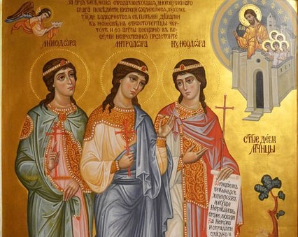 | 23 СЕНТЯБРЯ 2013 (Понедельник) 11:11:37 Святые девицы Минодора, Митродора и Нимфодора (305–311), родные сестры, происходили из Вифинии (Малая Азия). Отличаясь особым благочестием, сестры-христианки пожелали хранить девственную жизнь и не соприкасаться с миром. Они избрали себе уединенное место в пустыне и проводили свою жизнь в подвигах поста и молитвы. Слава о святой жизни девиц скоро распространилась, так как по их молитвам стали совершаться исцеления больных. Вифинской областью управлял в то время правитель по имени Фронтон, который приказал схватить сестер и привести к нему. Сначала он пытался убедить их отречься от Христа, обещая большие почести и награды. Однако святые сестры твердо исповедали пред ним свою веру, отвергнув все предложения правителя, объяснив ему, что они не дорожат временными земными благами и готовы умереть за своего Небесного Жениха. Придя в ярость, правитель обрушил свой гнев на старшую из них – святую Минодору. Святая мужественно терпела муки и, наконец, воскликнула: «Господи Иисусе Христе, веселие сердца моего, надежда моя, приими с миром душу мою!» и с этими словами предала дух свой Богу. Через четыре дня привели на суд младших сестер Митродору и Нимфодору. Перед ними положили для устрашения израненное тело старшей сестры. Девицы плакали о ней, но были также непреклонны. Тогда подвергли истязаниям святую Митродору. Она скончалась, призывая до последнего вздоха возлюбленного ею Господа Иисуса Христа. Затем подвели третью сестру Нимфодору. Перед ней лежали тела замученных старших сестер. Фронтон надеялся, что это зрелище устрашит юную девицу. Делая вид, что он сожалеет о ее молодости и красоте, он стал ласково убеждать ее поклониться языческим богам, обещая высокие награды и почести. Святая Нимфодора, отвергнув его речи, разделила участь своих старших сестер. Она была замучена до смерти ударами железных прутьев. Тела святых мучениц хотели сжечь на костре, но сильный дождь угасил разведенный огонь, а молния опалила Фронтона и его слуг. Христиане взяли тела сестер и погребли с почестью около так называемых Теплых вод в Пифиях (Вифиния). Часть мощей святых мучениц хранится на Афоне в Покровском соборе Русского Пантелеимонова монастыря, а рука святой Митродоры находится на Святой Горе в монастыре Пантократор./ sobor.by/ (просмотров 4702) |