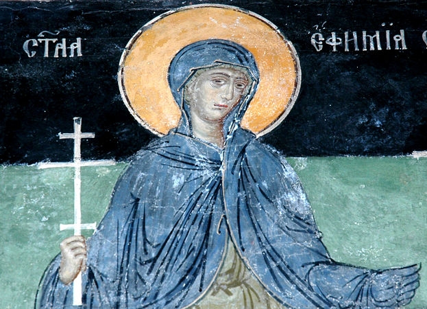| 29 СЕНТЯБРЯ 2014 (Понедельник) 12:53:17 Святая великомученица Евфимия всехвальная была дочерью христиан - сенатора Филофрона и Феодосии. Она пострадала за Христа в городе Халкидоне, расположенном на берегу Босфора, напротив Константинополя, около 304 года.Халкидонский правитель Приск разослал приказание всем жителям Халкидона и его окрестностей явиться на языческий праздник поклониться и принести жертву идолу Арен, угрожая великими муками тому, кто не исполнит приказания. Во время этого нечестивого празднества 49 христиан скрывались в одном доме, где тайно совершали Божественную службу Истинному Богу. Среди молящихся находилась и юная девица Евфимия. Вскоре о местопребывании христиан стало известно, и они были приведены к Приску для ответа. В течение 19 дней мучеников подвергали различным пыткам и истязаниям, но никто из них не поколебался в вере и не согласился принести жертву идолу. Разгневанный правитель, не зная, каким еще способом принудить христиан к отречению, послал их на суд к императору Диоклитиану, но отделил от них самую юную - девицу Евфимию, надеясь, что она, оставшись одна, не выдержит испытаний. Святая Евфимия, разлученная со своими братьями по вере, усердно молилась Господу Иисусу Христу, чтобы Он Сам укрепил ее в предстоящем подвиге. Сначала Приск уговаривал святую отречься, обещая земные блага, потом дал приказание мучить ее. Мученица была привязана к колесу с острыми ножами, которые при вращении отрезали куски тела. Святая громко молилась. И вот колесо само собой остановилось и не двигалось при всех усилиях палачей. Сошедший с неба Ангел Господень снял Евфимию с колеса и исцелил от ран, святая же с веселием благодарила Господа. Не вразумившись чудом, мучитель повелел воинам Виктору и Сосфену бросить святую в раскаленную печь. Но те, увидев в пламени двух грозных Ангелов, отказались исполнить приказание правителя и сами уверовали в Бога, Которому поклонялась Евфимия. Дерзновенно возгласив, что и они христиане, Виктор и Сосфен смело пошли на страдания. Они были отданы на съедение зверям. Во время казни они взывали к милосердию Божию, чтобы Господь и их принял в Царство Небесное. Услышав призывавший их небесный Глас, они отошли в жизнь вечную. Звери же даже не дотронулись до их тел. Святая Евфимия, брошенная другими воинами в печь, осталась цела. С Божией помощью она выходила невредимой после многих других пыток и истязаний. Приписывая это волшебству, правитель велел выкопать новый ров, наполнил его ножами, а сверху прикрыл землей и травой, чтобы мученица не знала о приготовленной ей казни; но и тут святая Евфимия осталась невредимой, легко прошедши надо рвом. Наконец, ее осудили на съедение зверям в цирке. Перед казнью святая стала просить, чтобы Господь сподобил ее умереть. Ни один зверь, выпущенный на арену, не бросился на святую. Лишь одна медведица нанесла ей небольшую рану на ноге, из которой истекла кровь, и святая великомученица Евфимия тотчас скончалась. В это время произошло землетрясение, стражники и зрители от страха бежали, так что родители святой смогли взять ее тело и с честью похоронить недалеко от Халкидона. Впоследствии на могиле великомученицы Евфимии был возведен величественный храм. В этом храме происходили заседания IV Вселенского Собора в 451 году, во время которых святая великомученица чудесным 