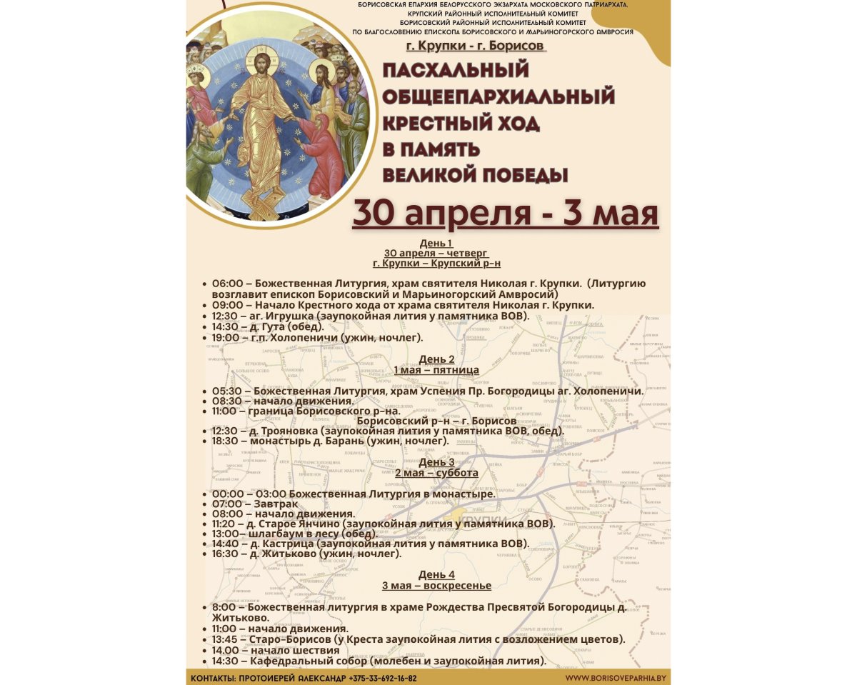 | С 30 апреля по 3 мая в Борисовской епархии состоится Пасхальный общеепархиальный крестный ход в память Победы в Великой Отечественной войне.