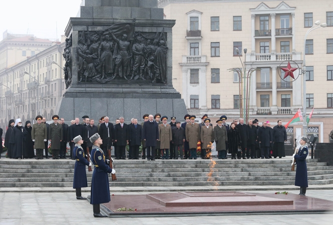 К подножию монумента были возложены венки от Президента Республики Беларусь, республиканских органов государственного управления, судов, Национального собрания, Совета безопасности и Вооруженных Сил, правоохранительных органов, Минского областного и Минского городского исполнительных комитетов, Православной и Католической Церквей, крупнейших общественных организаций Беларуси, ветеранов, представителей дипломатического корпуса, исполнительного комитета СНГ, передает БелТА.
