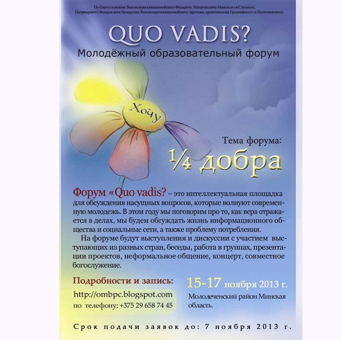 | 5 ДЕКАБРЯ 2013 (Четверг) 15:52:43 Чарговы выпуск праграмы «Святло душы» раскажа пра маладзёжны адукацыйны форум «Quo vadis?», які сабраў каля сотні ўдзельнікаў з Беларусі, Украіны і Расіі. Форум прайшоў у трэці раз, яго арганізатарамі выступіла аб'яднанне моладзі Беларускай Праваслаўнай Царквы. «Камо грядеши, Господи?» ( Куды Ты ідзеш, Гасподзь?,лацінскае- Quo vadis, Domine?), прамовіў апостал Петр, пакідаючы Рым падчас ганенняў, калі сустрэў на сваім шляху Хрыста. У пераносным сэнсе словы «Камо грядеши?» прапануюць задумацца, якімі духоўнымі арыенцірамі чалавек кіруецца ў жыцці, таму першы дзень форуму прапанаваў паразважаць на тэму “Справы дабра ў сучасным свеце”.На сустрэчу прыехалі прадстаўнікі епархій Беларускай Праваслаўнай Царквы разам са святарамі, якія працуюць з праваслаўнай моладдзю. У гомельскай епархіі гэтым актыўна займаецца архімандрыт Сава Мажука, які пачаў размову на тэму меры дабра ў свеце: “ Известна притча о сеятеле.... Одно зерно упало при дороге, другое - на камень, третье - в тернии и только четвертое - на благодатную почву и принесло плод. В этой притче показана определенная евангельская статистка: только одна четверть добра выживает, усваивается, три четверти - гибнет. В каждой конкретной ситуации «непонятое» или «не принятое» добро очень ранит нас. Для нас очень важно, чтобы кто-то заметил то добро, которое мы делаем, подбодрил нас на этом пути. А в жизни зачастую происходит так: мы делаем добро, ждем одобрения, не получаем его и опускаем руки. В результате мы «оцарапаны» друг другом. Нами усваивается, «не заподазривается» в тайном умысле только одна четвертая добра. Мы знаем, что Господь желает нам добра, почему же путь добра трагичен в этом мире?”.... Пытанне наконт меры дабра ў свеце выклікала жывое абмеркаванне ў групах, а закончыліся практычнай справай. Спачатку прадстаўніца інтэртэт-партала TUT.BY Яўгенія Чарняўская расказала пра сучасныя сацыяльныя інтэрнэт-праекты, а потым прапанавала правесці “майстэрню сацыяльных праектаў”. Узброеныя ватманам, маркерамі, маладыя людзі разбіліся на групы і горача ўзяліся за працу. Трэба было сумесна распрацаваць ідэю пэўнай сацыяльнай дапамогі і яе рэалізацыю ў інтэрнэт-прасторы. Потым прадстаўнік кожнай групоўкі коратка презентаваў праект. Дарэчы, адзін з іх, які назвалі лепшым, называўся “Порцыя дабра” і прапаноўваў ежу для малазабяспечаных людзей. Самым важным момантам форуму была Літургія, якая адбылся ў храме Ражджаства Іаана Прадцечы, што ў весцы Аляхновічы. Разам з архіепіскапам Гродзенскім і Ваўкавыскім Арцеміям яе правялі настаяцель Свята - Петрапаўлаўскага сабора Мінска, духаўнік АМБПЦ Георгій Латушка, наместнік старшыні Сінадальнага аддзела па справах моладзі Украінскай Праваслаўнай Царквы Іаан Транько, духавенства, якое прымала ўдзел у форуме. Праваслаўная моладзь не только слухала лекцыі і ўдзельнічала ў дыскусіях, адна з якіх была прысвечана праблемам экалогіі і футуралогіі. Былі розныя займальныя гульні, такія як “фотапаляванне” . Дарэчы, форум праходзіў ў маляўнічым месцы- на базе адпачынку “Алеся” пад Аляхновічамі. На вольным паветры трэба было інсцэніраваць евангельскую прытчу і сфатаграфаваць вынік сваіх намаганняў, каб іншыя маглі здагадацца, якая прытча мелася на ўвазе. Вечарамі моладзь сустракалася са сасвятарамі, вяліся доўгія задушэўныя раз