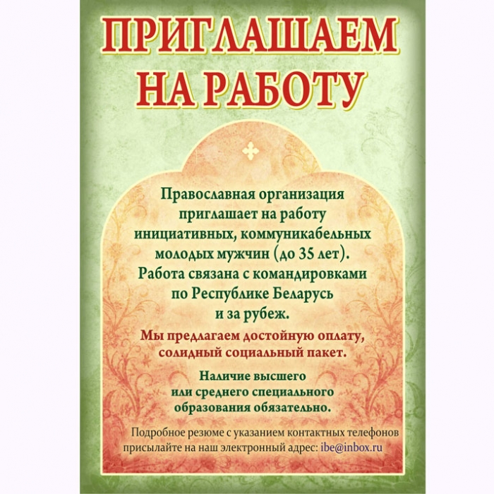 | | 11 СЕНТЯБРЯ 2013 (Среда) 14:22:44 Православная организация приглашает на работу инициативных коммуникабельных молодых мужчин (до 35 лет). Работа связана с командировками по Республике Беларусь и за рубеж. Мы предлагаем достойную оплату, солидный социальный пакет. Наличие высшего или среднего специального образования обязательно. Подробное резюме с указанием контактных телефонов присылайте на адрес ibe@inbox.ru. / sobor.by/ (просмотров 4235) |
