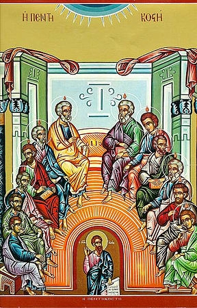 Согласно Евангелие, когда апостолы собрались на Сионской горе в Иерусалиме, сошло пламя, окружив каждого из них. После этого апостолы получили дар проповедовать веру Христову на всех языках мира. Сошествие Святого Духа показывает заботу Триединого Бога о мире, когда Бог-Отец творит мир, Бег-Сын искупает грехи человеческие, а Бог-Святой Дух освящает мир через Церковь и проповеди.