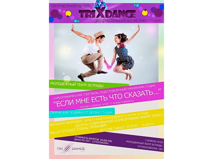 Показ 35-минутного спектакля состоится в Молодёжном театре эстрады в рамках концертной программы, посвящённой 10-летию Школы танцев “TriX Dance Studio”.