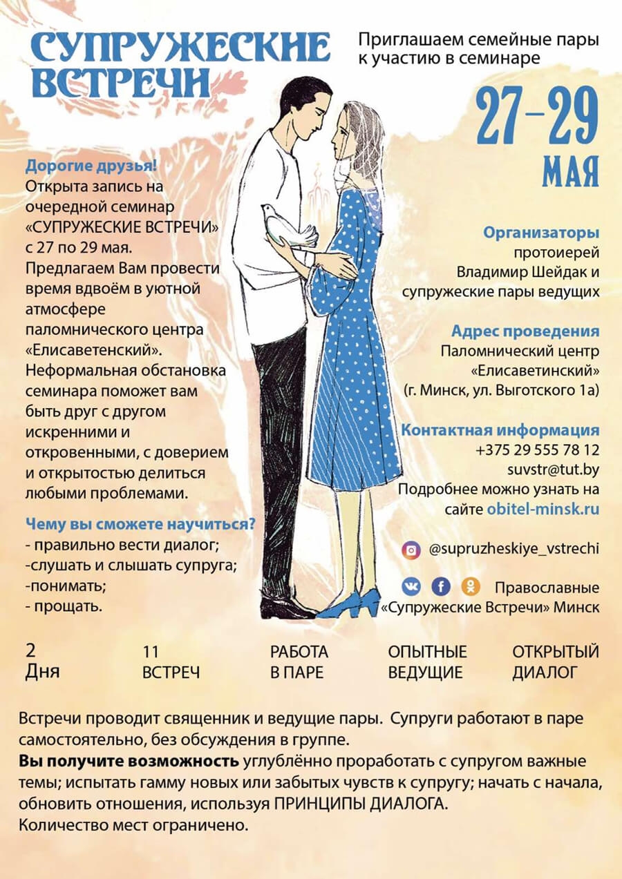 | 14 МАЯ 2022 (Суббота) 10:51:22 Семинар "Супружеские встречи" пройдет с 27 по 29 мая в Паломническом центре "Елисаветинский" города Минска.Встречу организовывают настоятель храма святителя Николая в городе Логойск протоиерей Владимир Шейдак с супругой Инной. Как супружеская пара, отец Владимир и матушка Инна принимают участие в работе Православного епархиального центра "Супружеские встречи" в Санкт-Петербурге, основанного протоиереем Александром Дягилевым. Полученный опыт и желание помочь другим подвигли их на проведение аналогичной работы в Минске. "Супружеские встречи" – это школа диалога между супругами. Программа известна во всем мире более 40 лет благодаря своей действенной методике, направленной на гармонизацию и развитие отношений между супругами, а также помощь парам, находящимся в кризисной ситуации. Методика одобрена Патриаршей комиссией поддержки семьи, защиты материнства и детства РПЦ. Работа семинара предусматривает участие обоих супругов без детей. Супруги работают в паре самостоятельно, без обсуждения в группе. Место проведения – Паломнический центр "Елисаветинский" (город Минск, улица Выготского, 1А). Проезд на автобусах №№ 18, 26, а также на маршрутке № 1318 от станции метро "Площадь Победы" до остановки "Цэнтр псіхічнага здароўя". Получить дополнительную информацию и записаться можно по телефону: +375 29 555 78 12 и электронной почте: syvstr@tut.by// sobor.by/ (просмотров 1713) |