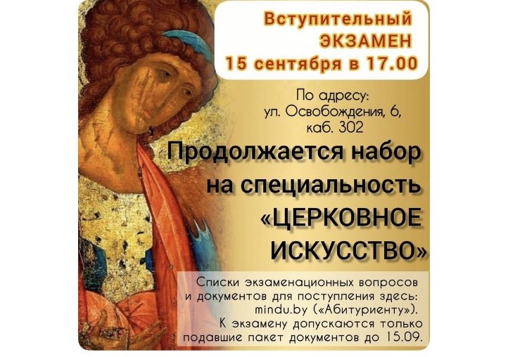 | 27 АВГУСТА 2025 (Среда) 14:51:01 Минское духовное училище продолжает набор на специальность «Церковное искусство».Вступительный экзамен - 15 сентября в 17.00 Ро адресу: Минск, ул. Освобождения, 6, в кабинете 302. Списки экзаменационных вопросов и документов для поступления здесь. К экзамену допускаются абитуриенты, подавшие пакет документов до 15.09. Экзаменационные вопросы: 1. Где сохранились древнейшие христианские изображения? 2. Перечислите раннехристианские символы, встречающиеся в росписях, мозаиках и иконах. Что они обозначают? 3. Раннехристианские символы и образы, обозначающие Евхаристию. 4. Типы изображений, встречающиеся в катакомбах. Сюжеты. 5. Символические изображения Иисуса Христа в раннехристианском искусстве. 6. Важнейшие Вселенские Соборы, на которых обсуждались вопросы, связанные с иконопочитанием. Назовите даты и расскажите о том, какие важные решения были приняты на них. 7. Художественный и символический язык иконы. Символика цвета в иконе. Пространство и время иконы (основные понятия). 8. Типы святых и их изображения на иконах. Святые в храмовых росписях. 9. Традиционная структура русского пятиярусного иконостаса. Смысл и роль. История формирования и развития. 10. Источники христианской иконографии (основные понятия с примерами). 11. Творчество Феофана Грека. 12. Творчество преп. Андрея Рублева. 13. Творчество Дионисия. 14. Образы Воскресения Христова. Основные иконографические композиции. 15. Древнейшие памятники церковного искусства Беларуси. / sobor.by/ (просмотров 1180) |