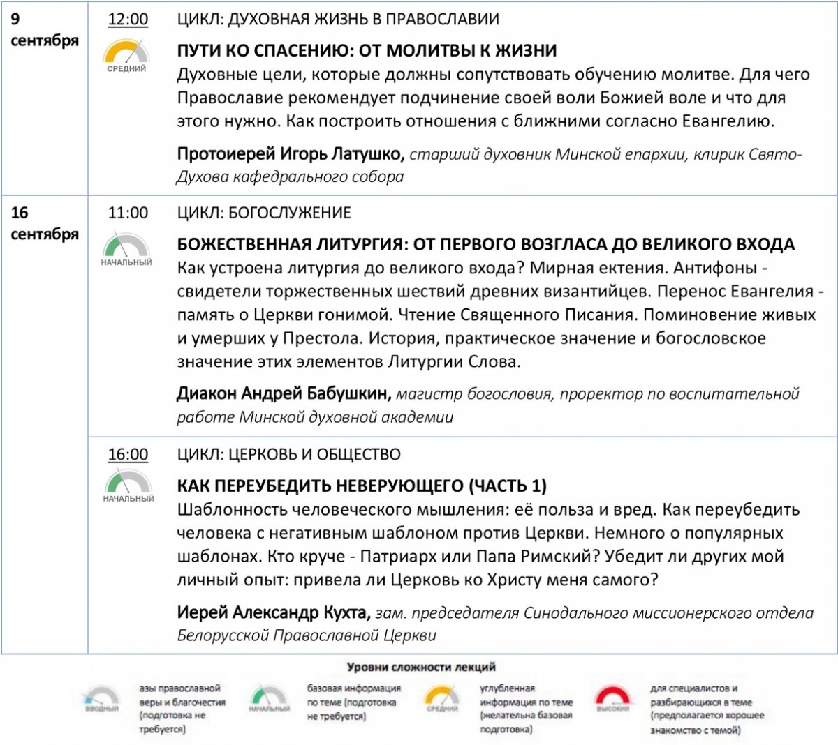 После летних каникул просветительские курсы для всех желающих "Свет Православия" при Минской духовной академии возобновляют работу и приглашают слушателей уже в это воскресение, 9 сентября, на лекцию о молитве протоиерея Игоря Латушко. Подробнее о лекции, а также расписание курсов на первую половину сентября смотрите ниже.