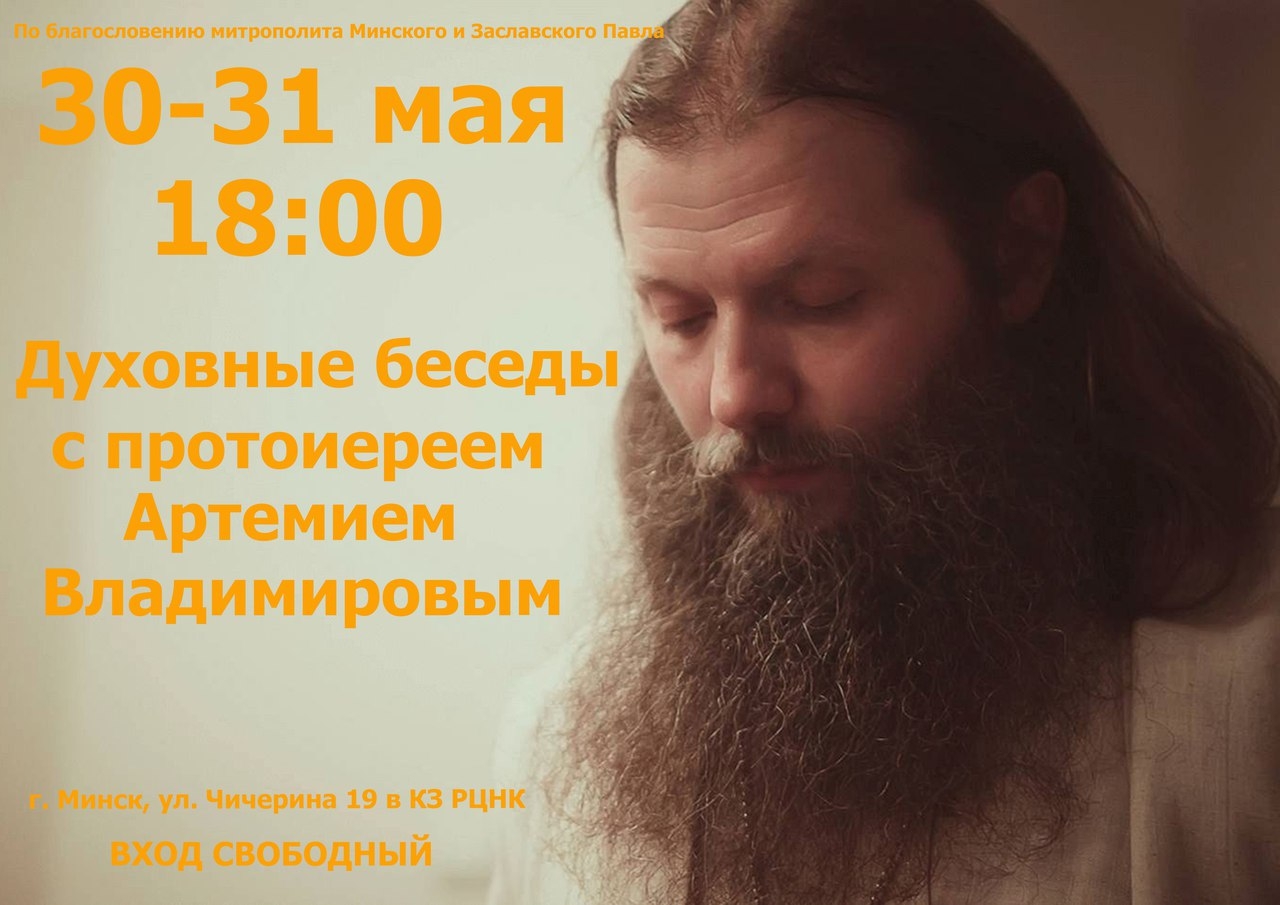 | | 22 МАЯ 2016 (Воскресение) 23:42:44 По благословению митрополита Минского и Заславского Павла в рамках мероприятий, проводимых к Дню славянской письменности и культуры в Минске и Борисове состоятся творческие встречи с протоиереем Артемием Владимировым в формате духовных бесед: