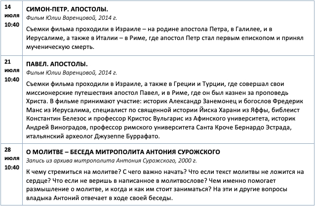 | 15 ИЮЛЯ 2019 (Понедельник) 11:06:50 На период летних отпусков и каникул просветительские курсы "Свет Православия" приостанавливают проведение лекций. Лекции продолжатся с сентября. Вместо них проходит кинолекторий – просмотр фильмов и их обсуждение со священниками – клириками храма святителя Кирилла Туровского и преподавателями МинДА.Расписание кинолекторий на июль: 14 июля 10:40 СИМОН-ПЕТР. АПОСТОЛЫ Фильм Юлии Варенцовой, 2014 г. Съёмки фильма проходили в Израиле – на родине апостола Петра, в Галилее, и в Иерусалиме, а также в Италии – в Риме, где апостол Пётр стал первым епископом и принял мученическую смерть. 21 июля 10:40 ПАВЕЛ. АПОСТОЛЫ Фильм Юлии Варенцовой, 2014 г. Съёмки фильма проходили в Израиле, а также в Греции и Турции, где совершал свои миссионерские путешествия апостол Павел, и в Риме, где он был казнён за проповедь Христа. В фильме принимают участие: историк Александр Занемонец и богослов Фредерик Манс из Иерусалима, специалист по священной истории Йиска Харани из Яффы, библеист Константин Белезос и профессор Кристос Вульгарис из Афинского университета, историк Андрей Виноградов, профессор римского университета Санта Кроче Бернардо Эстрада, итальянский археолог Джузеппе Буррафато. 28 июля 10:40 О МОЛИТВЕ – БЕСЕДА МИТРОПОЛИТА АНТОНИЯ СУРОЖСКОГО Запись из архива митрополита Антония Сурожского, 2000 г. К чему стремиться на молитве? С чего важно начать? Что если текст молитвы не ложится на сердце? Что если не веришь в написанное в молитвослове? Чем именно помогает размышление о молитве, и когда и как им стоит заниматься? На эти и другие вопросы владыка Антоний отвечает в ходе своей беседы. Справка: Напоминаем, что курсы "Свет Православия" начали работу 25 февраля 2018 года на базе храма в честь святителя Кирилла Туровского при Минской духовной академии. Лекции проходят по воскресеньям (одна или две лекции в день, как указано в расписании) в актовом зале Минской духовной академии. Курсы разработаны преподавателями Духовной академии для всех, кто желает глубже понять Православие, постичь его красоту и истинность, разобраться в истории Православной Церкви и отличиях Православия от других конфессий. Посещение лекций свободное. Адрес Минской духовной академии: г. Минск, ул. Зыбицкая, 27 (станция метро "Немига"). Вход через храм святителя Кирилла Туровского. Группа курсов "Свет Православия" вконтакте >> / sobor.by/ (просмотров 3465) |