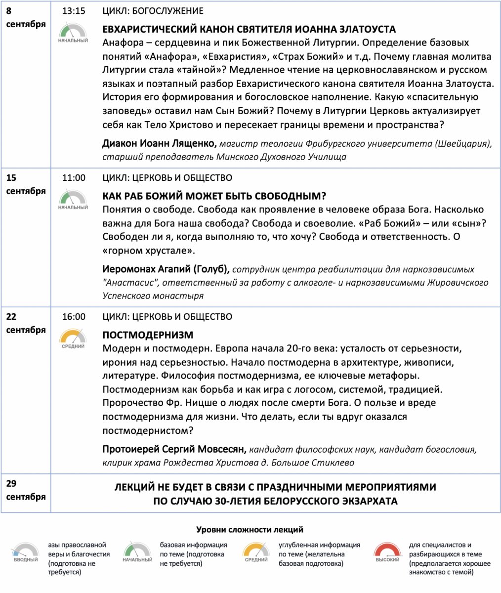 | 5 СЕНТЯБРЯ 2019 (Четверг) 17:10:42 Публикуем расписание лекций курсов "Свет Православия" при Минской духовной академии на сентябрь.8 сентября в 13.15 ЕВХАРИСТИЧЕСКИЙ КАНОН СВЯТИТЕЛЯ ИОАННА ЗЛАТОУСТА Анафора – сердцевина и пик Божественной литургии. Определение базовых понятий "Анафора", "Евхаристия", "Страх Божий" и т.д. Почему главная молитва Литургии стала "тайной"? Медленное чтение на церковнославянском и русском языках и поэтапный разбор Евхаристического канона святителя Иоанна Златоуста. История его формирования и богословское наполнение. Какую "спасительную заповедь" оставил нам Сын Божий? Почему в Литургии Церковь актуализирует себя как Тело Христово и пересекает границы времени и пространства? Лектор - диакон Иоанн Лященко, магистр теологии Фрибургского университета (Швейцария), старший преподаватель Минского духовного училища. 15 сентября в 11.00 КАК РАБ БОЖИЙ МОЖЕТ БЫТЬ СВОБОДНЫМ? Понятия о свободе. Свобода как проявление в человеке образа Бога. Насколько важна для Бога наша свобода? Свобода и своеволие. "Раб Божий" – или "сын"? Свободен ли я, когда выполняю то, что хочу? Свобода и ответственность. О "горном хрустале". Лектор - иеромонах Агапий (Голуб), сотрудник центра реабилитации для наркозависимых "Анастасис", ответственный за работу с алкоголе- и наркозависимыми Жировичского Успенского монастыря. 22 сентября в 16.00 ПОСТМОДЕРНИЗМ Модерн и постмодерн. Европа начала 20-го века: усталость от серьёзности, ирония над серьёзностью. Начало постмодерна в архитектуре, живописи, литературе. Философия постмодернизма, её ключевые метафоры. Постмодернизм как борьба и как игра с логосом, системой, традицией. Пророчество Фр. Ницше о людях после смерти Бога. О пользе и вреде постмодернизма для жизни. Что делать, если ты вдруг оказался постмодернистом? Лектор - протоиерей Сергий Мовсесян, кандидат философских наук, кандидат богословия, клирик храма Рождества Христова д. Большое Стиклево. 29 сентября лекций не будет в связи с праздничными мероприятиями по случаю 30-летия Белорусского Экзархата. Справка: Напоминаем, что курсы "Свет Православия" начали работу 25 февраля 2018 года на базе храма в честь святителя Кирилла Туровского при Минской духовной академии. Лекции проходят по воскресеньям (одна или две лекции в день, как указано в расписании) в актовом зале Минской духовной академии. Курсы разработаны преподавателями Духовной академии для всех, кто желает глубже понять Православие, постичь его красоту и истинность, разобраться в истории Православной Церкви и отличиях Православия от других конфессий. Посещение лекций свободное. Адрес Минской духовной академии: г. Минск, ул. Зыбицкая, 27 (станция метро "Немига"). Вход через храм святителя Кирилла Туровского. Группа курсов "Свет Православия" вконтакте >> / sobor.by/ (просмотров 1778) |