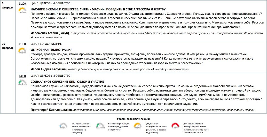 | 31 ЯНВАРЯ 2019 (Четверг) 15:33:11 В первой половине февраля просветительские курсы "Свет Православия" при Минской духовной академии приглашают на новые лекции из циклов "Церковь и общество" и "Богослужение". Описание лекций смотрите ниже. Приглашаются все желающие! Вход свободный.Расписание курсов "Свет Православия" на февраль (также смотрите в иллюстрации к новости): 3 февраля. Насилие в семье и обществе: снять маски. Победить в себе агрессора и жертву Начало в 11:00. Понятие о насилии в семье (и не только). Основные виды насилия. Стадии развития насилия. Сценарии и роли. Почему важно своевременное распознавание насилия? Насилие по отношению к наркозависимым лицам. Агрессия и насилие: различие и связь. Влияние паттернов на жизнь в своей семье и социуме. Апостол Павел о взаимоотношениях в семье. Христианское отношение к насилию. Христианская жертвенность и позиция "жертвы". Меняем отношение к себе! Ресурсы помощи жертвам и агрессорам. Роль священнослужителя в помощи обращающимся по проблеме насилия. Презентация семинара "Анастасис". Просьба к желающим принять участие во встрече - самостоятельно просмотреть фильм режиссёра Андрея Полупанова "Половина меня": https://youtu.be/tY5bCXDxBM8 Лектор: иеромонах Агапий (Голуб), сотрудник центра реабилитации для наркозависимых "Анастасис", ответственный за работу с алкоголе- и наркозависимыми Жировичского Успенского монастыря. *** 10 февраля. Церковная гимнография Начало в 11:00. Стихира, тропарь, кондак, канон, прокимен, аллилуарий, причастен, антифоны, полиелей и многое другое. В чём разница между этими элементами богослужения, которые мы слышим каждую неделю? Что кроется за каждым из названий? Когда появились те или иные элементы гимнографии и какие колоссальные изменения произошли с некоторыми из них за прошедшие столетия? Каково их место в богослужении? Лектор: иерей Андрей Бабушкин, магистр богословия, проректор по воспитательной работе Минской духовной академии. 10 февраля. Социальное служение БПЦ: обзор и участие Начало в 14:30. Социальное служение как помощь нуждающимся и как самый действенный способ миссионерства. Помощь многодетным и малообеспеченным семьям, людям с зависимостями, инвалидам, бездомным, больным, сиротам. Беседы с собирающимися сделать аборт, помощь молодым мамам в трудной ситуации. Особенности помощи разным категориям нуждающихся. Каковы требования к занимающимся социальным служением? Как можно поучаствовать – единоразово или долгосрочно. Как узнать, кому помочь важнее, и как понять, где я лучше справлюсь? Что делать, если не справляешься с потоком просящих? Как не разочароваться, видя страдания и несправедливость, и как избежать выгорания при социальном служении. Лектор: протоиерей Кирилл Шолков, председатель Синодального отдела по церковной благотворительности и социальному служению Белорусской Православной Церкви. Справка: Напоминаем, что курсы "Свет Православия" начали работу 25 февраля на базе храма в честь святителя Кирилла Туровского при Минской духовной академии. Лекции проходят по воскресеньям (одна или две лекции в день, как указано в расписании) в актовом зале Минской духовной академии. Курсы разработаны преподавателями Духовной академии для всех, кто желает глубже понять Православие, постичь его красоту и истинность, разобраться в истории Православной Церкви и отличиях 