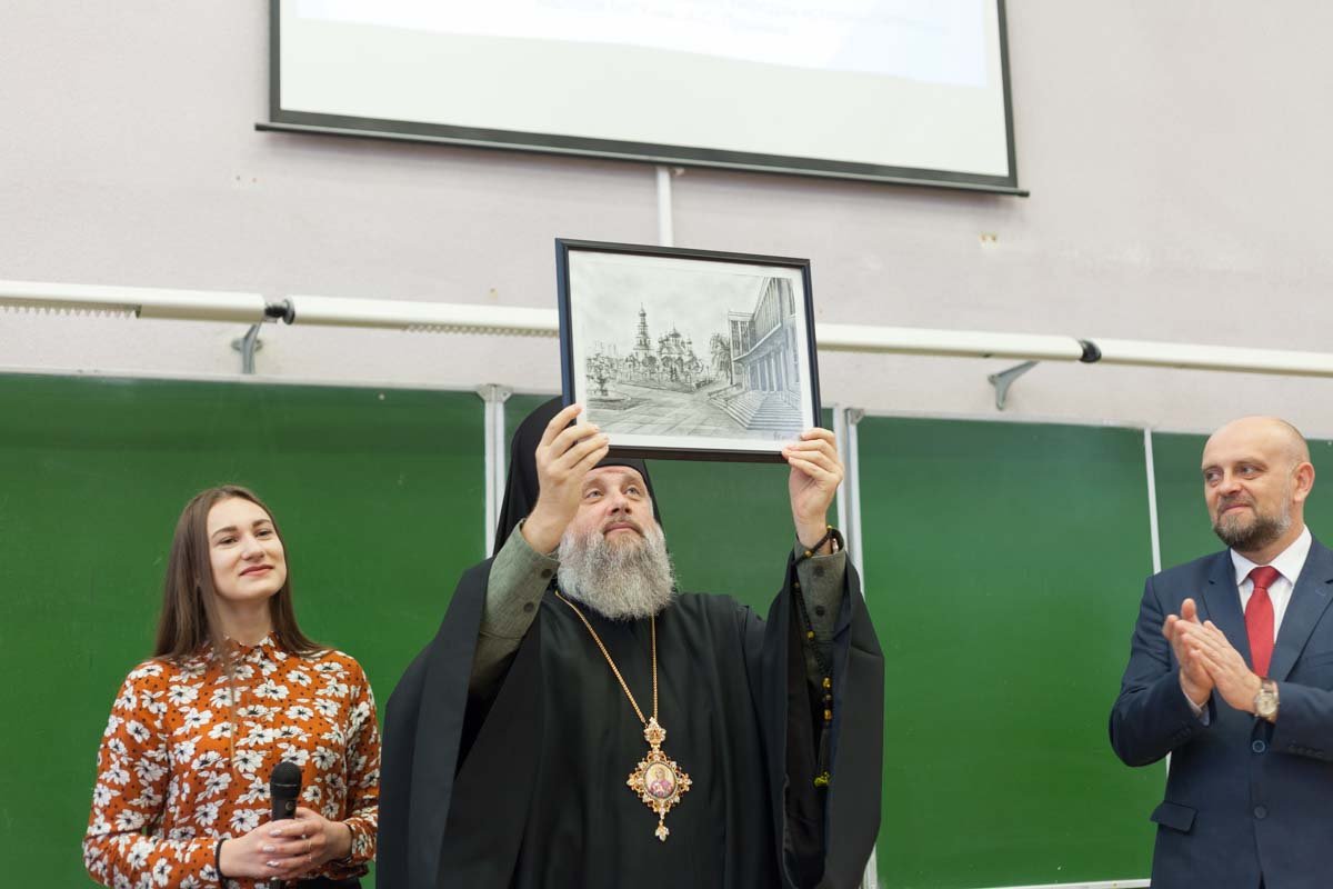 В состав президиума пленарного заседания вошли: Архиепископ Брестский и Кобринский Иоанн, кандидат богословия, доцент; ректор БрГТУ, кандидат технических наук, доцент А.В. Драган; проректор по воспитательной работе БрГТУ, кандидат технических наук, доцент Н.П. Яловая.