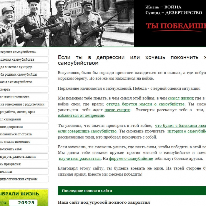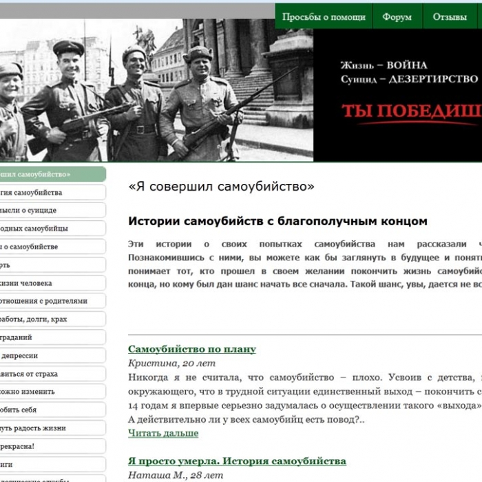 | | 10 СЕНТЯБРЯ 2013 (Вторник) 14:30:03 В России состоится суд над одним из самых посещаемых антисуицидных интернет-ресурсов - сайтом Победишь.ру.