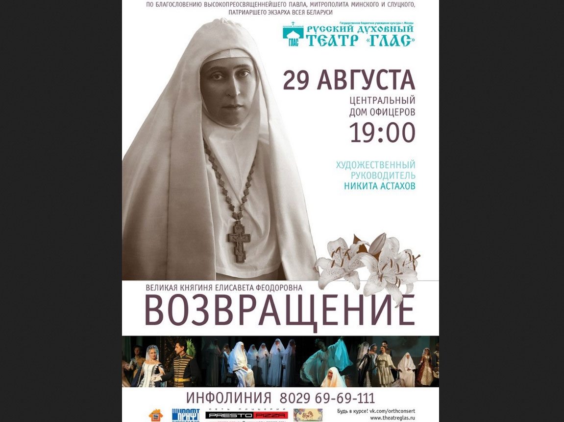 | | 11 ИЮЛЯ 2014 (Пятница) 21:20:59 Русский духовный театр «Глас», по благословению Митрополита Минского и Слуцкого Павла, 29 августа представит на сцене Дома офицеров спектакль «Великая княгиня Елизавета Феодоровна. Возвращение». Художественный руководитель театра – Никита Астахов.