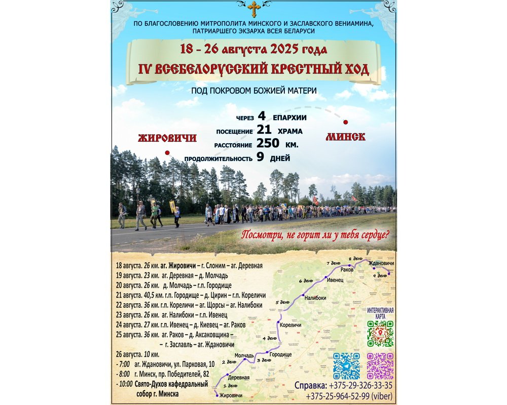 Молитвенное шествие начнется после Божественной литургии из Свято-Успенского Жировичского монастыря и завершится в Минском Свято-Духовом кафедральном соборе в день Минской иконы Божией Матери. За 9 дней паломники пройдут 250 километров. Их маршрут традиционно будет пролегать через 4 епархии и 21 храм. К участию в шествии приглашаются все желающие. Присоединиться к крестному ходу можно на любом отрезке пути.