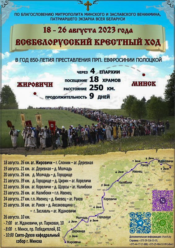 | 16 АВГУСТА 2023 (Среда) 10:48:27 В год 850-летия преставления прп. Евфросинии Полоцкой по благословению Митрополита Минского и Заславского Вениамина, Патриаршего Экзарха всея Беларуси, с 18 по 26 августа пройдет крестный ход из Свято-Успенского Жировичского монастыря в Минский Свято-Духов кафедральный собор. Завершится молитвенное шествие в день Минской иконы Божией Матери. За 9 дней паломники пройдут 250 км. Их маршрут будет пролегать через 4 епархии и 18 храмов.К участию в шествии приглашаются все желающие из Беларуси и зарубежья. Присоединиться к крестному ходу можно на любом отрезке пути. Маршрут крестного хода: 1 день – 18 августа (26 км). аг. Жировичи (Свято-Успенский Жировичский монастырь), Литургия, 09:00 выход – г. Слоним (Троицкий собор, Благовещенский женский монастырь) – 18.30 аг. Деревная (Троицкий храм). Ночлег. 2 день – 19 августа (21 км). Преображение Господне. аг. Деревная, Литургия, 07:30 выход – 15:00 д. Молчадь (Петро-Павловская церковь). Ночлег 3 день – 20 августа (26 км). Воскресный день. д. Молчадь, Литургия, 07:30 выход – 16:00 д. Городище (Крестовоздвиженская церковь). Ночлег. 4 день – 21 августа (39 км). д. Городище, Литургия, 05:45 выход – д. Цирин (храм святого Архангела Михаила) – 19:30 аг. Кореличи (Петропавловский храм). Ночлег. 5 день – 22 августа (36 км). аг. Кореличи, Литургия, 06:30 выход – д. Щорсы (Храм Димитрия Солунского) – 19:00 аг. Налибоки (Храм Архангела Михаила). Ночлег. 6 день – 23 августа (26 км). аг. Налибоки, Литургия, 06:30 выход – 17:30 г.п. Ивенец (Свято-Евфросиньевская церковь). Ночлег. 7 день – 24 августа (27 км). г.п. Ивенец, Литургия, 06:30 выход – д. Киевец (Троицкий храм) – 18:00 аг. Раков (церковь Преображения Господня). Ночлег. 8 день – 25 августа (36 км). аг. Раков, Литургия, 06:00 выход – д. Аксаковщина (храм иконы Божией Матери "Отрада и Утешение") – г. Заславль (собор Преображения Господня) – 18:30 аг. Ждановичи (Вознесенская церковь). Ночлег. 9 день – 26 августа (10 км). Минской иконы Божией Матери. аг. Ждановичи (Вознесенская церковь), 6:30 молебен, 07:00 выход – 08:00 Покровский храм г. Минска (пр. Победителей, 82), сбор участников последнего дня – 10:00 г. Минск, Свято-Духов кафедральный собор. Праздничная Литургия. Памятка для паломников: С собой желательно иметь всё то, что необходимо в многодневном походе с ночлегами в палатках и под открытым небом: кружку, миску, ложку, фляжку (пластиковую бутылку для воды), плащ-накидку, сменные носки, удобную (разношенную обувь), коврик и легкое одеяло или спальник, клеенку, куртку или свитер на случай холодной погоды. Из продуктов можно взять с собой орехи, сухофрукты, сухое галетное печенье, сухари, хлеб. Дополнительную информацию можно узнать по телефонам: Cергий Власовец +375-29-326-33-35, +375-25-964-52-99 (viber), Александр Нестерчук +375-44-77-21-888. Контакты епархиальных ответственных за составление организованных групп для участия в крестном ходе. Брестская епархия: Склизков Алексей Михайлович +375-29-729-20-18 Коробейко Елена Борисовна +375(33)331-97-89 Могилевская епархия Сидорович Илья Васильевич +375-44-701-20-77 Гомельская епархия Иерей Николай Савостьянов +375-29-909-40-35 Слуцкая епархия Довнар Марина Александровна +375-29-879-68-16 Бобруйская епархия Протоиерей Александр Лавицкий +375-29-687-07-91 Пинская епархия Протодиакон Андрей Горбунов +375-29-604-99-35 Новогрудская епархия Протоиерей Вадим Петлицкий +375-29-584-76-28 Витебская епархия Бондарь Николай Львович +375-29-214-09-31 Гродненская епархия Иерей Виталий Зубко +3