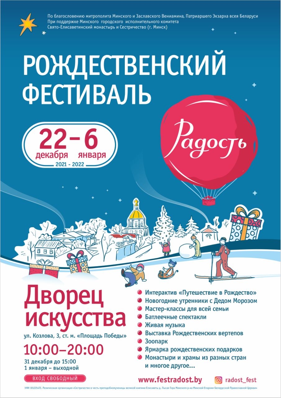 "Радость" — одно из главных рождественских событий в Минске! В это особенное время весь мир находится в ожидании Рождества Христова — душевного семейного праздника, когда и взрослые, и дети хотят проявить друг о друге. Приглашаем всех жителей и гостей Минска на наш фестиваль делиться праздничным настроением и радостью ожидания Рождества.