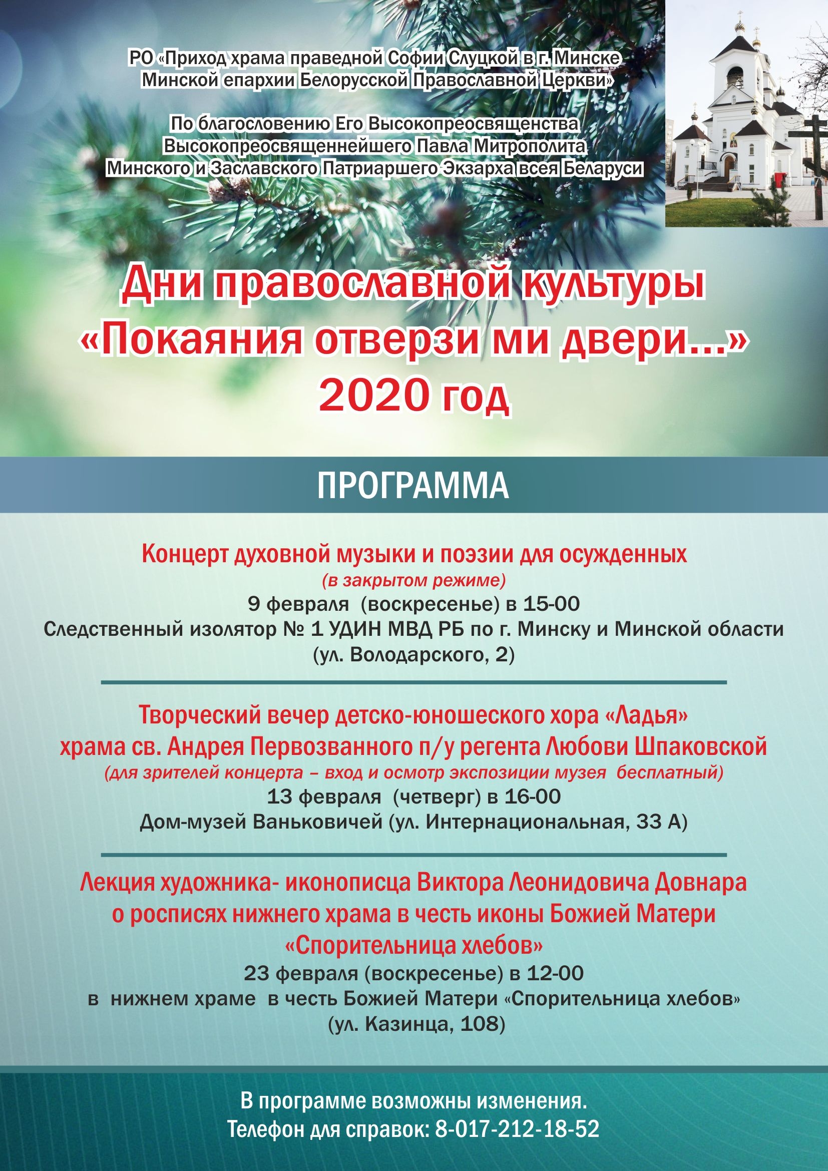 | | 4 ФЕВРАЛЯ 2020 (Вторник) 12:41:01 Минский приход храма праведной Софии Слуцкой, по благословению митрополита Минского и Заславского Павла, Патриаршего Экзарха всея Беларуси, продолжает Дни православной культуры в 2020 году под девизом "Покаяния отверзи ми двери...".