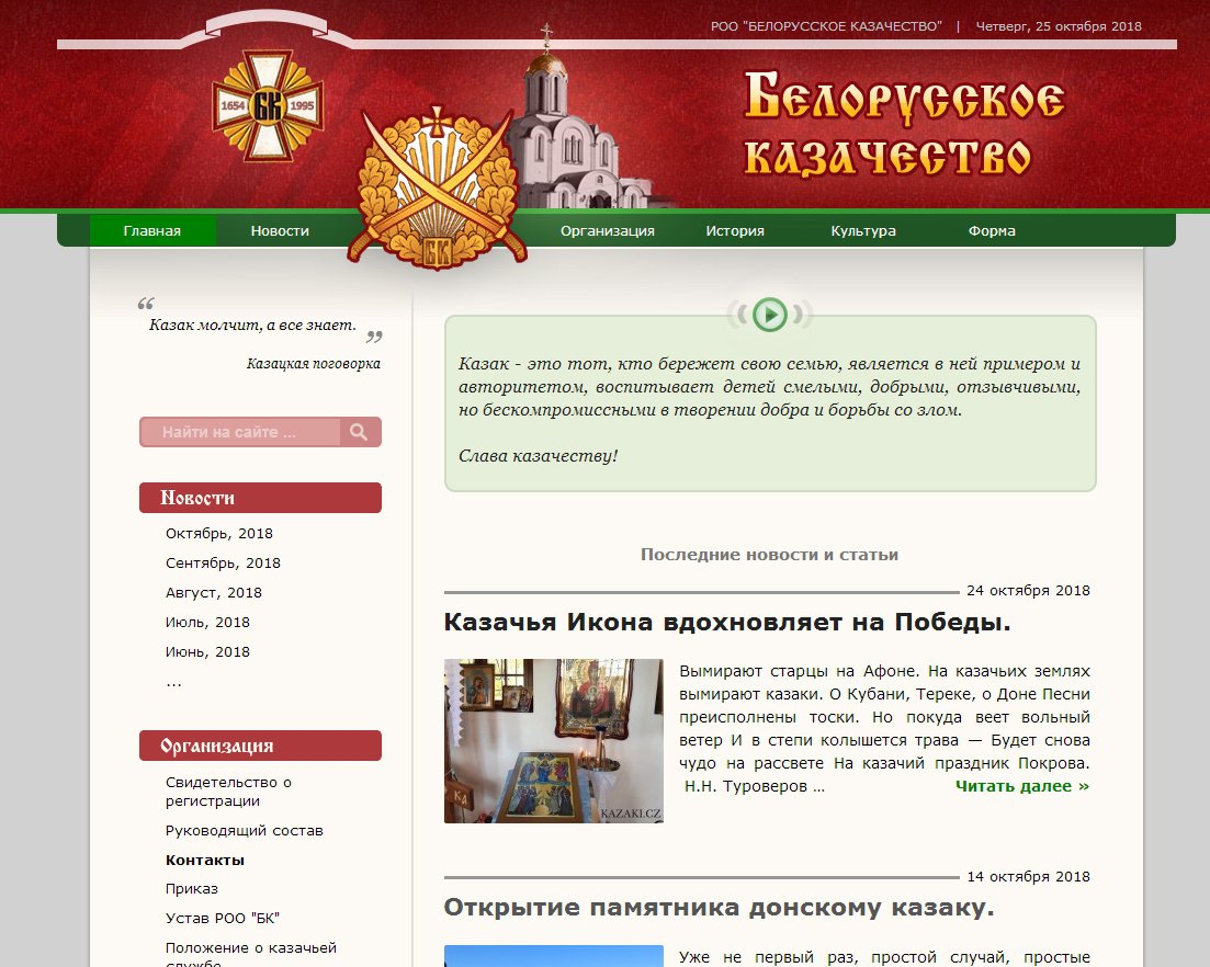 | 25 ОКТЯБРЯ 2018 (Четверг) 11:56:35 Минский приход иконы Божией Матери "Всех скорбящих Радость" и администрация сайта Sobor.by поздравляет партнёрский портал РОО "Белорусское казачество" belkazak.by с выходом на первое место по количеству просмотров в единой информационной сети казачьих сайтов. Минские казаки уже на протяжении многих лет сотрудничают с приходом иконы "Всех скорбящих Радость", а его настоятель протоиерей Игорь Коростелёв является духовником "Белорусского казачества". А в 2011 году Святой Синод утвердил отца Игоря на должность председателя отдела по работе с казачеством Белорусского Экзархата.По инициативе Казачьего Информационно-Аналитического Центра (КИАЦ) уже несколько лет проводиться работа по формированию единой информационной сети казачьих сайтов - это добровольное содружество казачьих и не казачьих, но дружественных им сайтов, ставящих целью объективное, всестороннее и своевременное информирование своих читателей о значимых событиях и процессах, происходящих в казачьей среде. На сегодня сформирован пул казачьих сайтов, которые по факту, большей частью не в активной форме или в тестовом режиме, уже вошли в состав сети сайтов. Всего в сети 57 сайтов. Сайт belkazak.by создан в 2014 году. Ресурс публикует последние новости из жизни РОО "Белорусское казачество", фото и видеорепортажи. Сегодня "Белорусское казачество" активно заявляет о себе в общественной и церковной жизни. Одним из последних мероприятий, в котором принимали участие минские казаки, стало восстановление старой могилы донского казака. Казаки расчистили территорию, залили фундамент для памятника и установили надгробный камень. Затем священник отслужил литию. В Беларуси казачье движение растёт и укрепляется. Сегодня здесь проживают потомки белорусских казаков, почитающие своих предков и хранящие в душе верность Родине и казачьим традициям, а также выходцы из других регионов России и Украины. Казаки активно участвуют в общественной и церковной жизни Беларуси: стараются быть примером не только на словах, но и на деле./ sobor.by/ (просмотров 1911) |