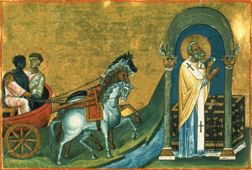 Из Эллады апостол Филипп отправился в Парфы, а затем в город Азот, где исцелил больные глаза дочери местного жителя Никоклида, принявшего его в свой дом и затем крестившегося со всем семейством.