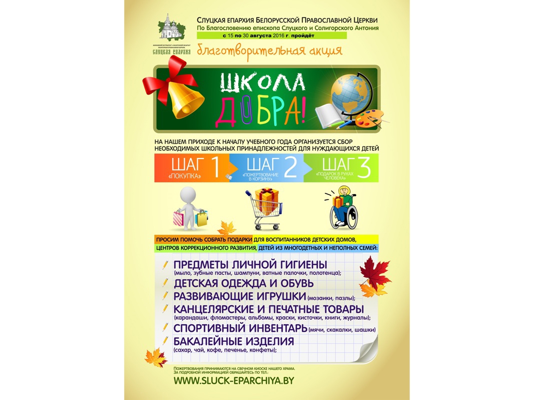 | | 22 АВГУСТА 2016 (Понедельник) 14:04:57 С 26 по 30 августа молодёжь Слуцкой епархии в рамках благотворительной акции "Школа Добра" проведёт сбор подарков в ТЦ "Радуга" и ТЦ "Маяк". Сбор подарков будет направлен на помощь детям из малообеспеченных семей, детям с инвалидностью и детям-сиротам.