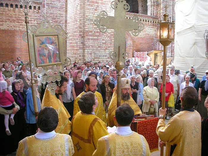 По окончании поздней Божественной литургии в Свято-Евфросиниевской церкви прихода иконы Божией Матери «Всех скорбящих Радость» крестным ходом духовенство и прихожане перешли в строящийся конкафедральный Радосте-Скорбященский собор. Здесь настоятель прихода протоиерей Игорь Коростелёв совершил молебен, за которым прихожане молились Господу о помощи в завершении строительства храма. Его высокопреподобию сослужили священник Александр Чернявский и диакон Дионисий Коростелёв. Молебен совершался в приделе во имя святителя Кирилла, епископа Туровского. Строительство Радосте-Скорбященского собора было начато в 1994г. Сегодня ведутся работы по покрытию куполов храма медью, изготовлению и золочению крестов. 3 августа был торжественно освящён и водружен крест, венчающий второй малый купол собора. (просмотров 3303)