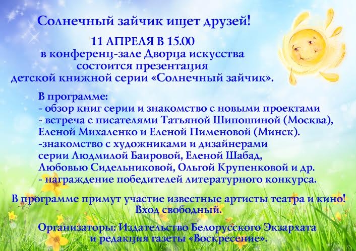 11 апреля в 15.00 в конференц-зале Дворца искусства в рамках выставки «Вербный кирмаш» состоится презентация детской книжной серии «Солнечный зайчик».
