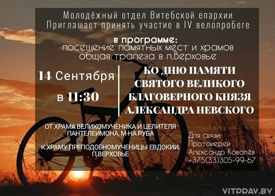 | | 8 СЕНТЯБРЯ 2025 (Понедельник) 21:02:45 14 сентября в 11.30 состоится IV велопробег от храма великомученика и целителя Пантелеимона микрорайона Руба города Витебска к храму преподобномученицы Евдокии п. Верховье.