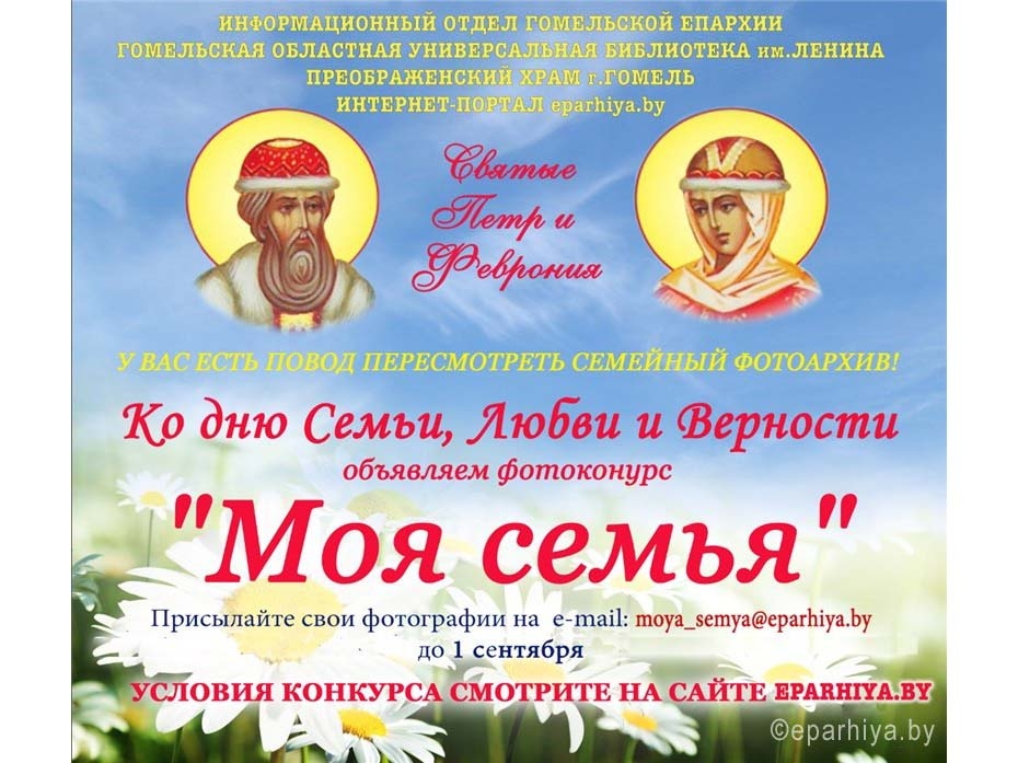 | | 24 ИЮНЯ 2015 (Среда) 10:43:41 Информационный отдел Гомельской епархии, Спасо-Преображенский храм города Гомеля и Гомельская областная библиотека им.В.И.Ленина объявили о старте фотоконкурса "Моя семья", посвящённого Дню семьи, любви и верности.