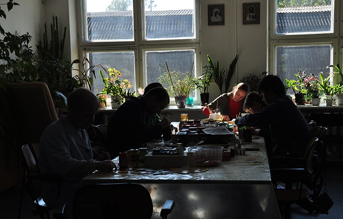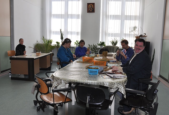 Руководитель мастерских Марина Кравцова рассказала студентам об основных направлениях работы с людьми с умственными и множественными нарушениями здоровья и провела экскурсию по отделам мастерских, где трудятся люди с особенностями развития: издательско-полиграфическому, свечному, столярно-слесарному и художественной деревообработки.